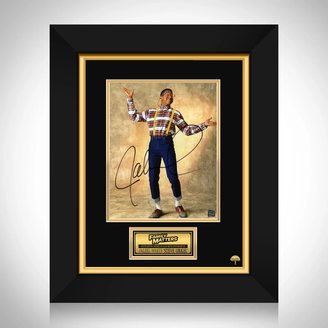 Pay homage to Family Matters &ย Steve Urkelย , with this gallery-framed, officially licensed, limited edition facsimile of the Hand-Signed photo, originally signed by Jaleel White, of which is strictly limited to 100 units Worldwide, and has been approved and numbered accordingly.