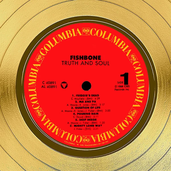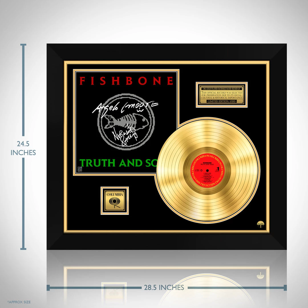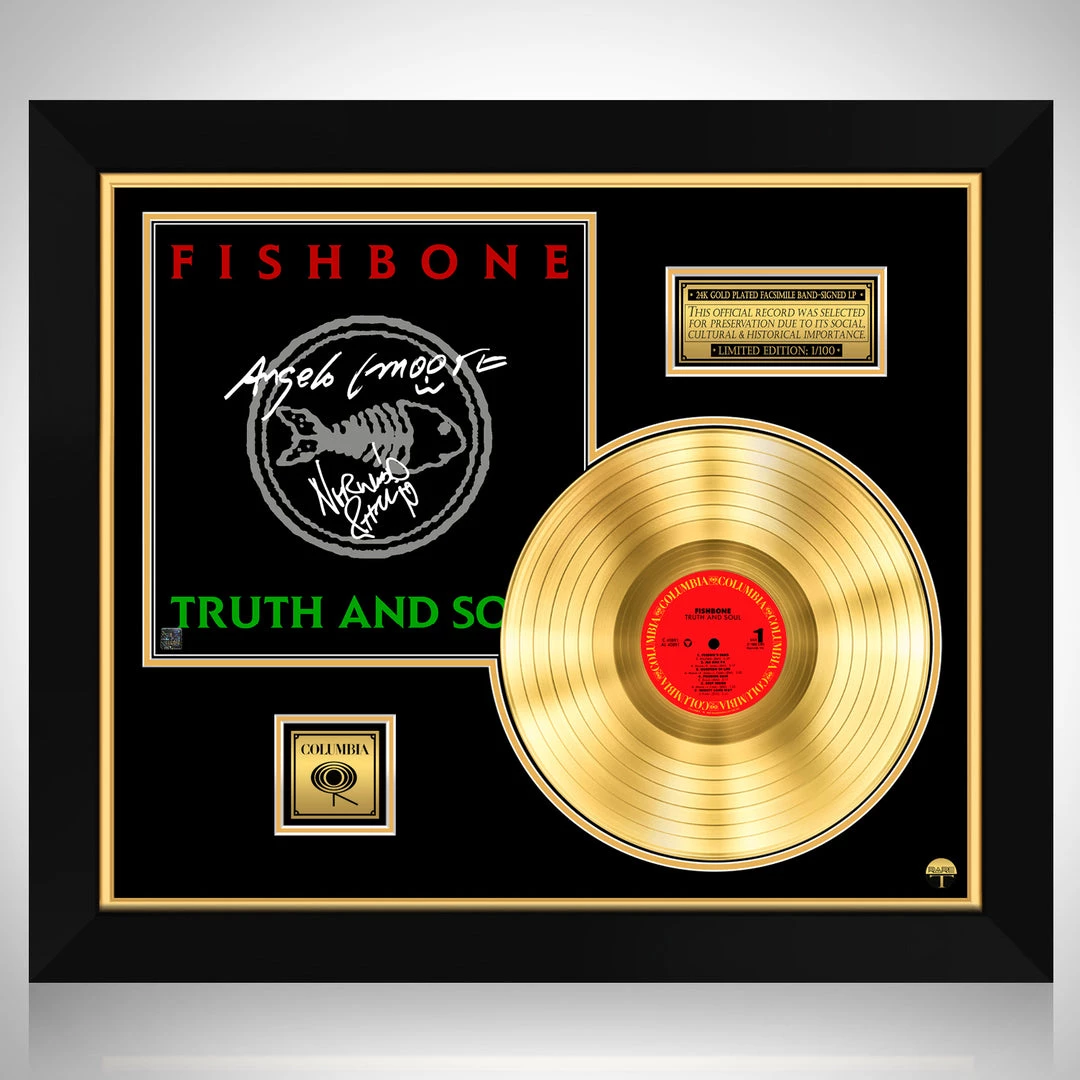 Pay homage to one of the most iconic American rock band of all time Fishbone , with this gallery-framed, authentic Columbia Pictures fully licensed facsimile of the official Hand-Signed 24K Gold LP Record and LP Cover Truth and Soul Originally signed by Norwood Fisher & Angelo Moore , of which is strictly limited to 100 units Worldwide and has been approved and numbered accordingly.