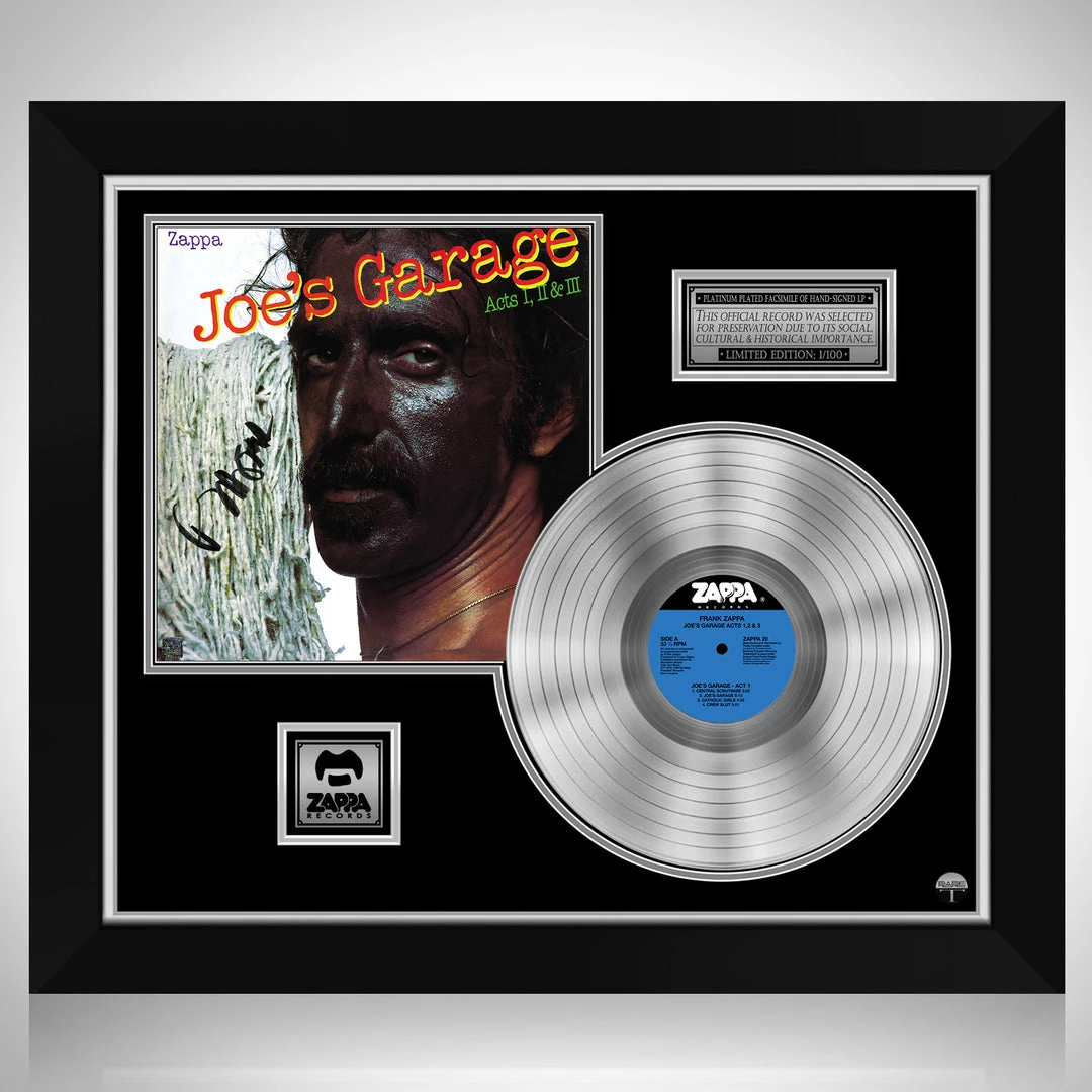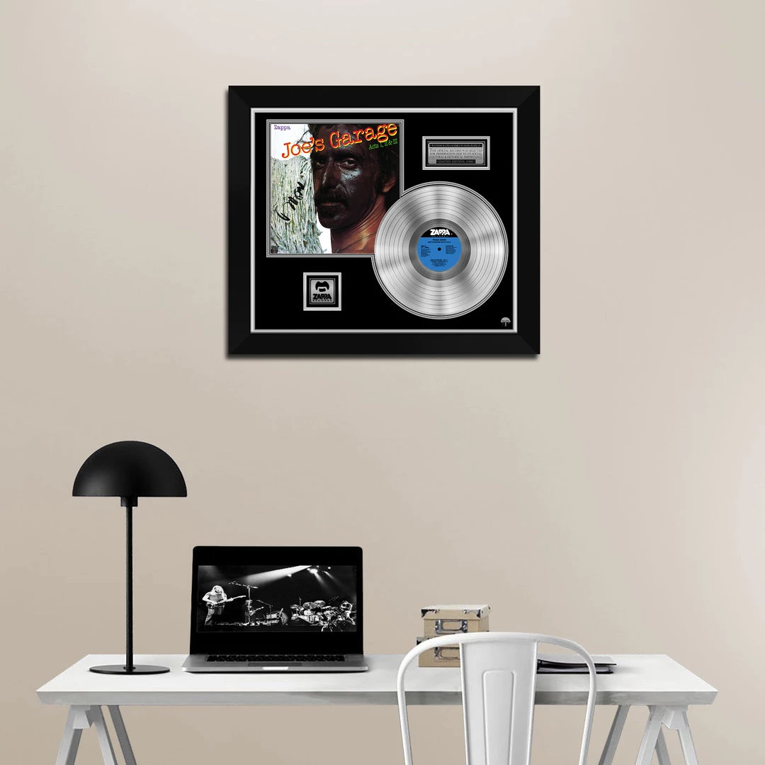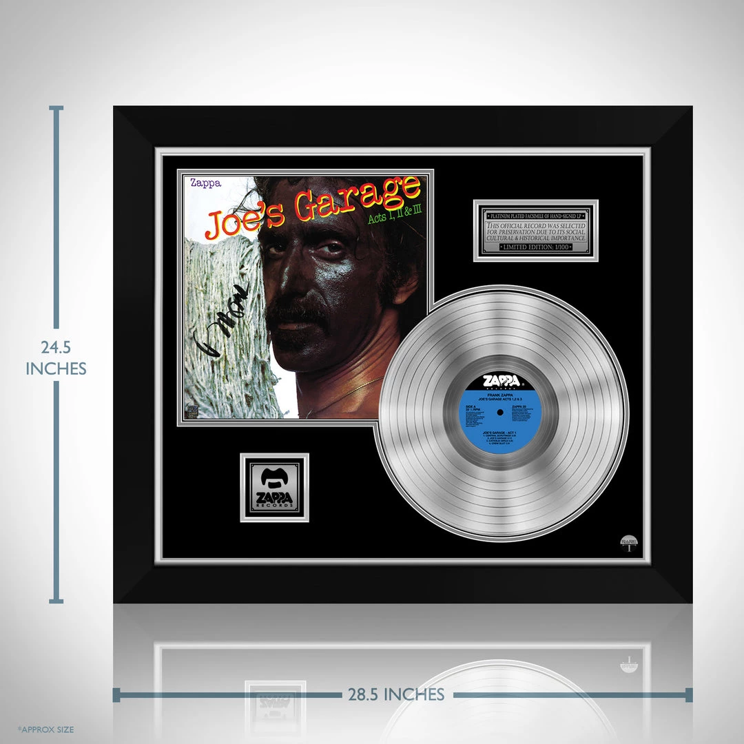 Pay homage to one of the most iconic American singer-songwriter, multi-instrumentalist, composer, bandleader of all time Frank Zappa , with this gallery-framed, authentic Zappa Records fully licensed facsimile of the official Hand-Signed Platinum Plated LP Record and LP Cover Joe’s Garage Originally signed by Frank Zappa , of which is strictly limited to 100 units Worldwide and has been approved and numbered accordingly.