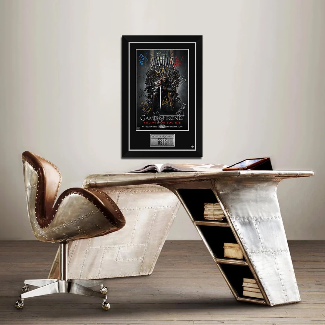 Pay homage to Game Of Thrones, with this gallery-framed, officially licensed, limited edition facsimile of hand-signed mini poster, originally signed by Kit Harington, Emilia Clarke, Peter Dinklage, Lena Headey, Nikolaj Coster-Waldau, Jack Gleeson, Sean Bean, Michelle Fairley, Iain Glen, and Jason Momoa , of which is strictly limited to 100 units Worldwide, and has been approved and numbered accordingly.