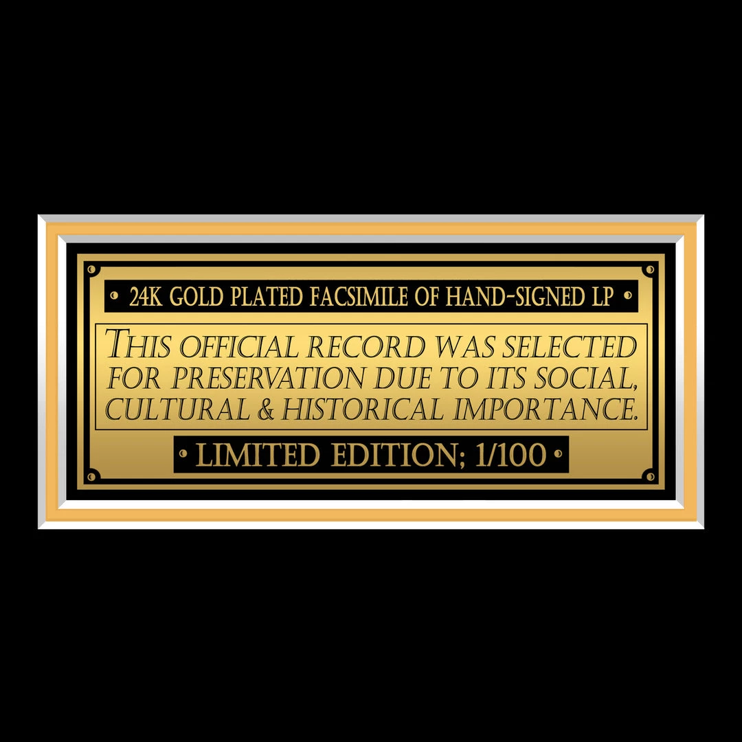 The 24K Gold LP and album cover facsimile are both professionally mounted in the highest quality triple matted wood shadow box frame with metallic fillet trim and finished with protective glass to keep it looking pristine. The customized descriptive metallic plaque, in addition to the detailed finishing and openings, add to the elegant and sophisticated gallery quality look.