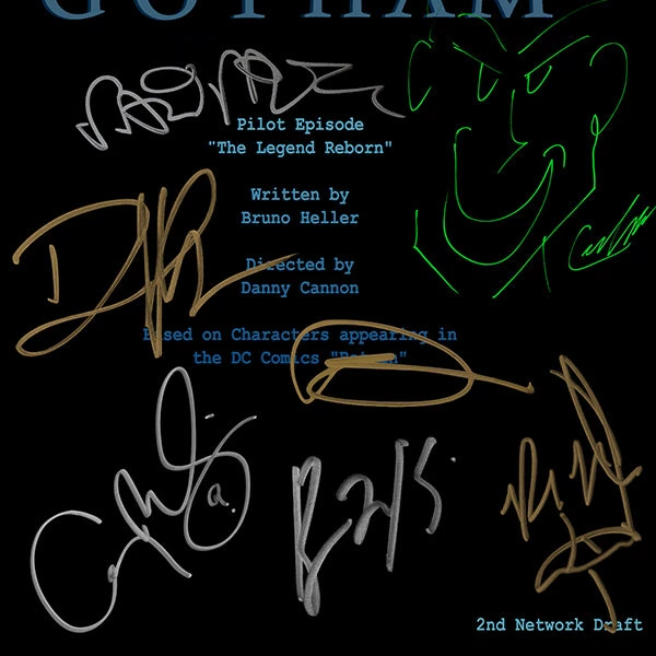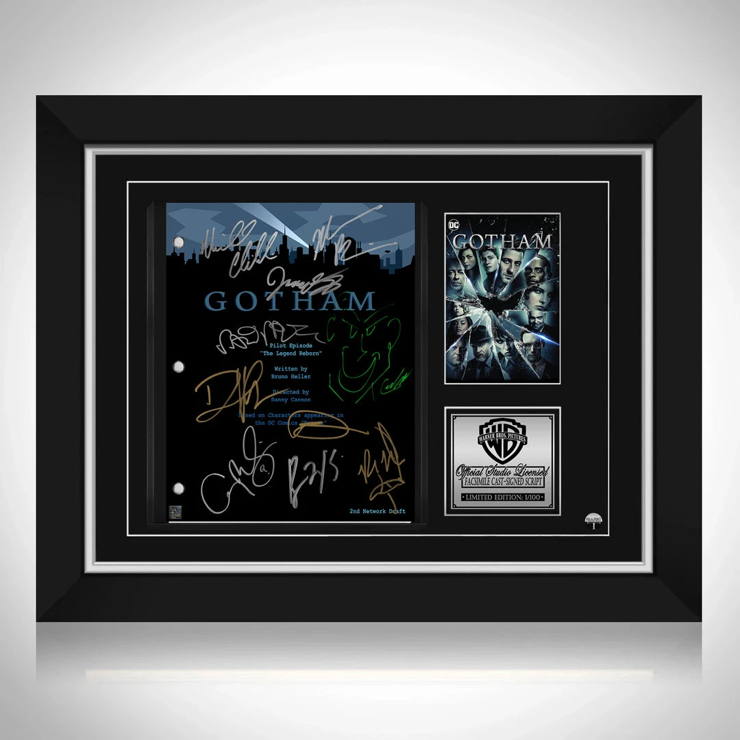 Pay homage to Gotham , with this Warner Bros. Pictures  fully licensed facsimile of the official signed TV Series script, originally signed by actors Ben McKenzie, Cory Michael Smith, David Mazouz, Donal Logue, Michael Chiklis, Morena Baccarin, Robin Lord Taylor, Cameron Monaghan & Sean Pertwee , of which is strictly limited to 100 units Worldwide and has been approved and numbered accordingly.