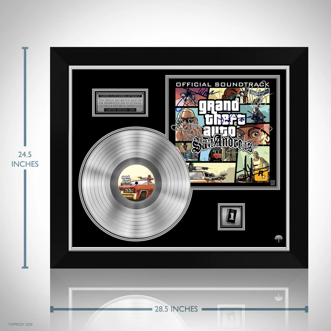 Pay homage to one of the most iconic video game of all time Grand Theft Auto San Andreas , with this gallery-framed, authentic Interscope Records fully licensed facsimile of the official Hand-Signed Platinum Plated LP Record and LP Cover Soundtrack Originally signed by Ice-T, Samuel L. Jackson, Peter Fonda, James Woods, Axl Rose & Chuck D , of which is strictly limited to 100 units Worldwide and has been approved and numbered accordingly.
