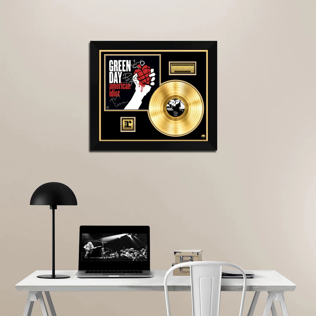 Pay homage to one of the most iconic American rock band of all time Green Day , with this gallery-framed, authentic Reprise records fully licensed facsimile of the official Hand-Signed 24K Gold LP Record and LP Cover American Idiot Originally signed by Billie Joe Armstrong, Mike Dirnt & Tre Cool , of which is strictly limited to 100 units Worldwide and has been approved and numbered accordingly.