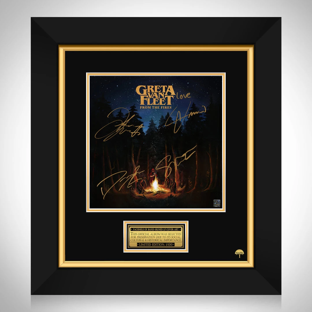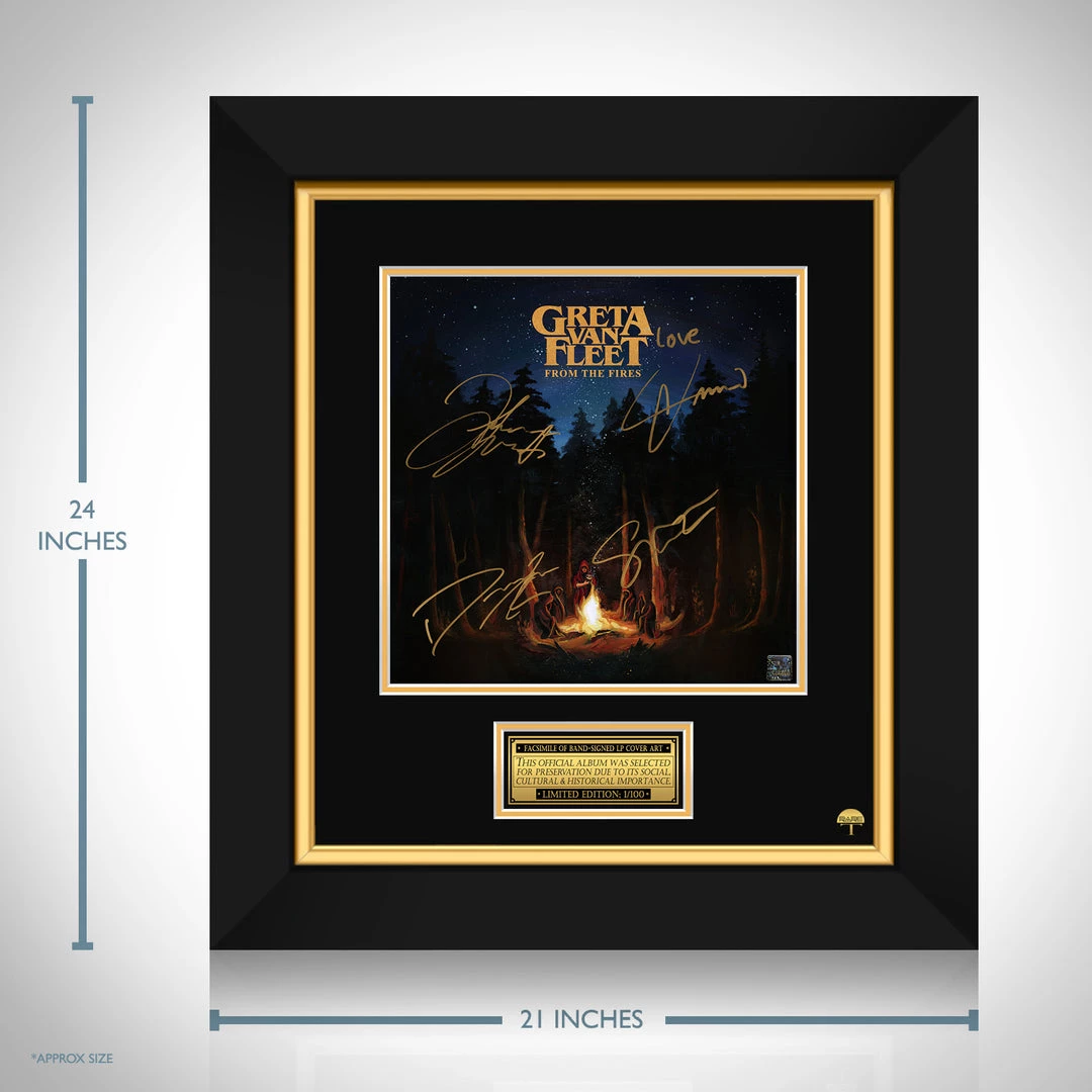 Pay homage to one of the most iconic American rock band of all time, Greta Van Fleet , with this gallery-framed, officially licensed, limited edition facsimile of the Hand-Signed From the Fires LP Cover originally signed by Joshua Kiszka, Jacob Kiszka, Samuel Kiszka & Daniel Wagner , of which is strictly limited to 100 units Worldwide, and has been approved and numbered accordingly.