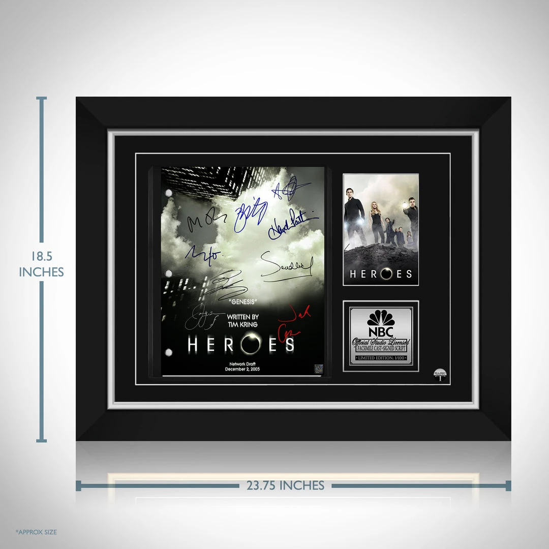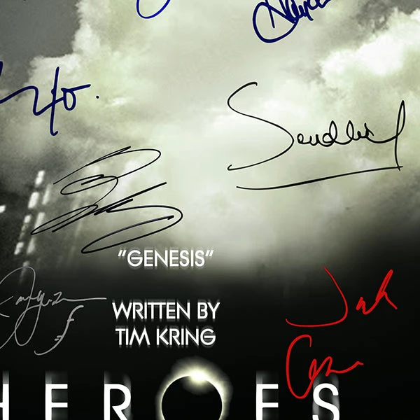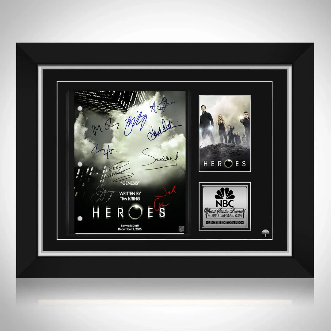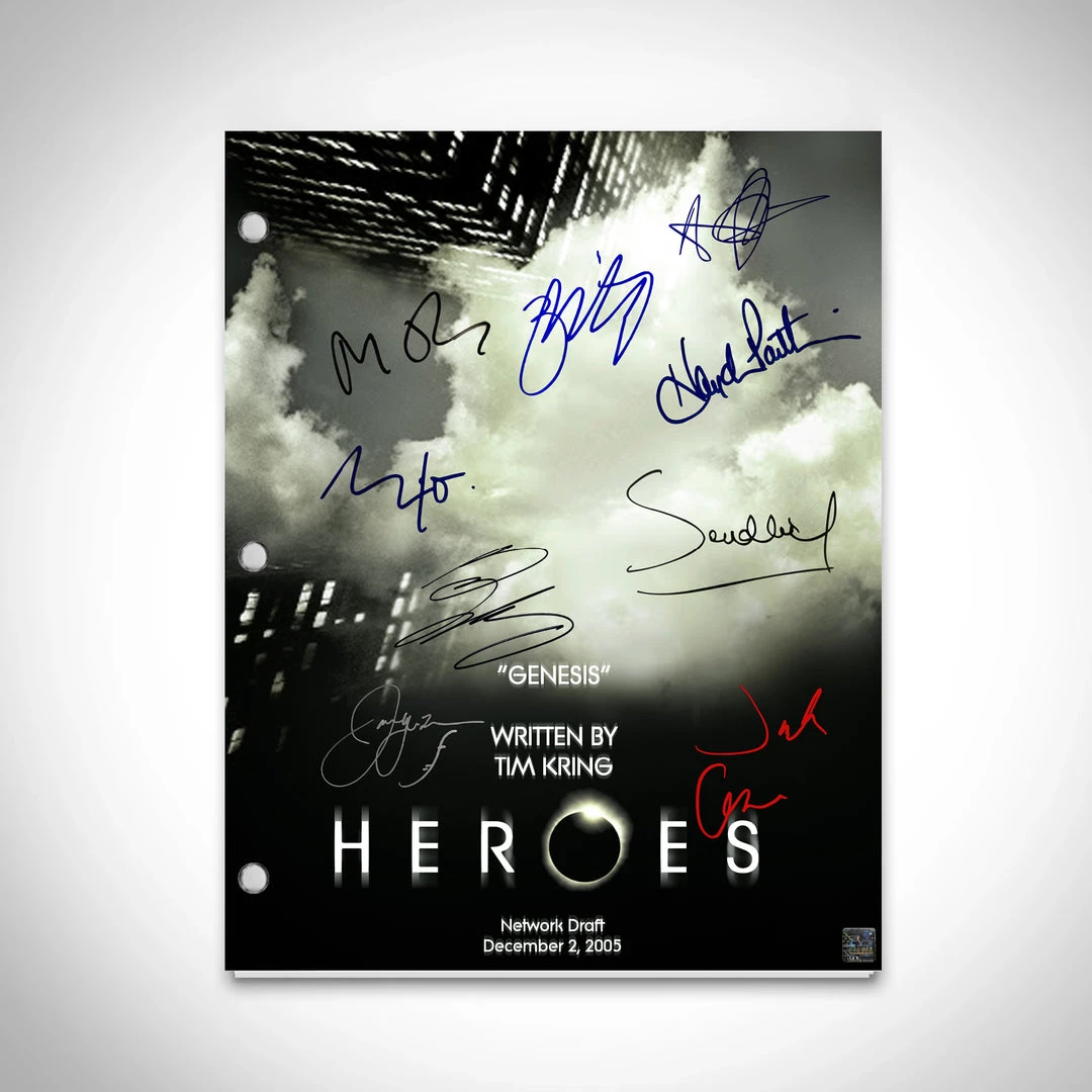 Pay homage to Heroes , with this NBC fully licensed facsimile of the official signed TV Series script, originally signed by actors Jack Coleman, Hayden Panettiere, Milo Ventimiglia, Masi Oka, Sendhil Ramamurthy, Greg Grunberg, James Kyson, Adrian Pasdar & Zachary Quinto , of which is strictly limited to 100 units Worldwide and has been approved and numbered accordingly.