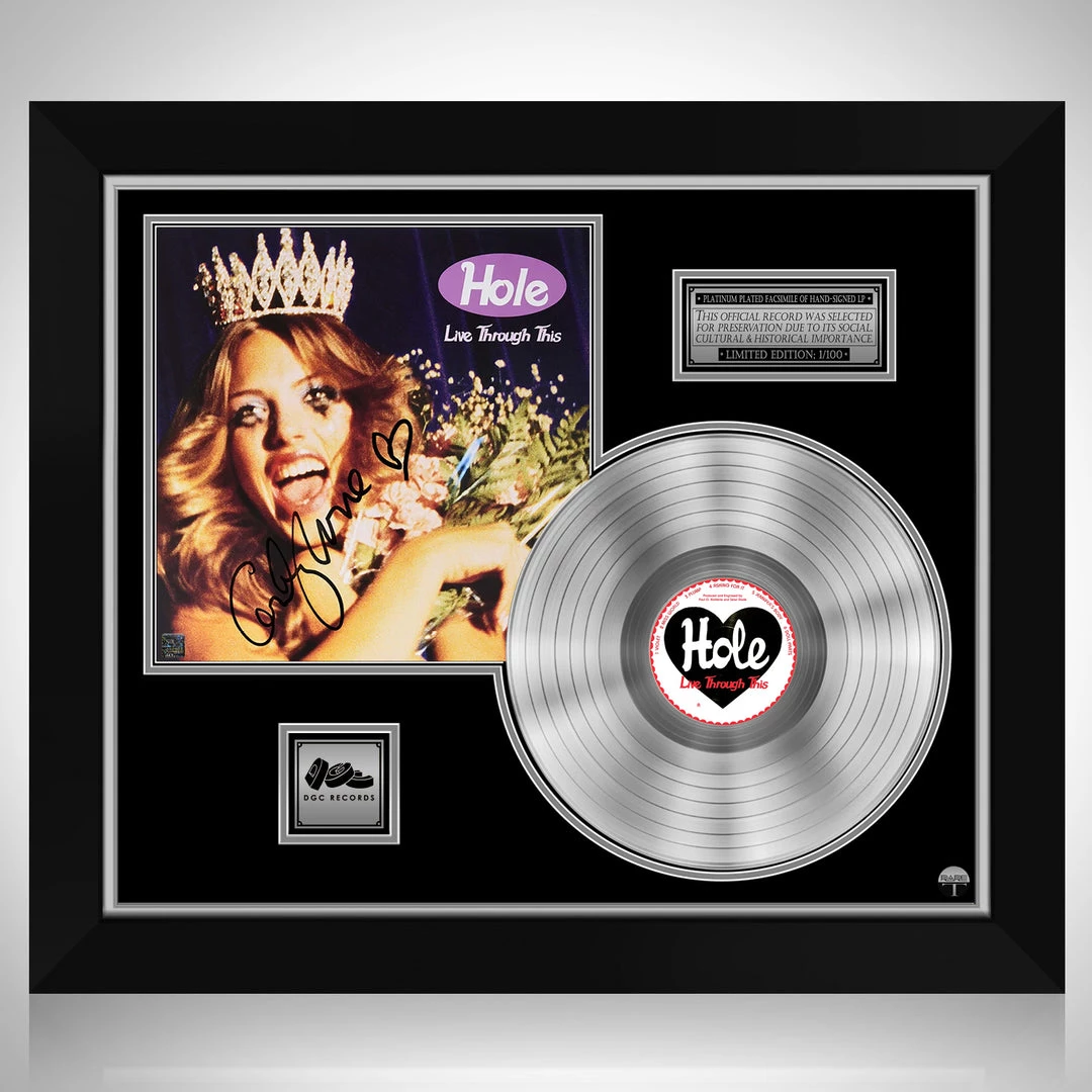 Pay homage to one of the most iconic band of all time Hole , with this gallery-framed, authentic DGC Records fully licensed facsimile of the official Hand-Signed Platinum Plated LP Record and LP Cover Live Through This Originally signed by Courtney Love , of which is strictly limited to 100 units Worldwide and has been approved and numbered accordingly.