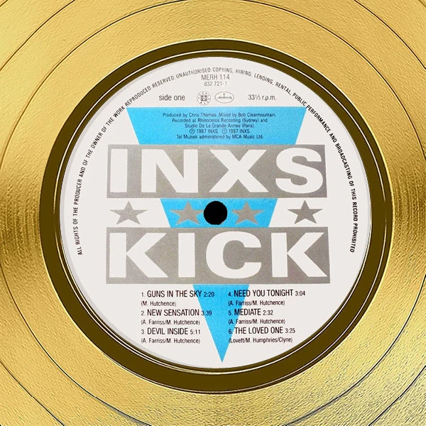 Pay homage to one of the most iconic Australian rock band of all time INXS , with this gallery-framed, authentic Mercury Records fully licensed facsimile of the official Hand-Signed 24K Gold LP Record and LP Cover Kick Originally signed by Michael Hutchence,Tim Farriss, Kirk Pengilly,Garry Gary Beers, Jon Farriss & Andrew Farriss , of which is strictly limited to 100 units Worldwide and has been approved and numbered accordingly.