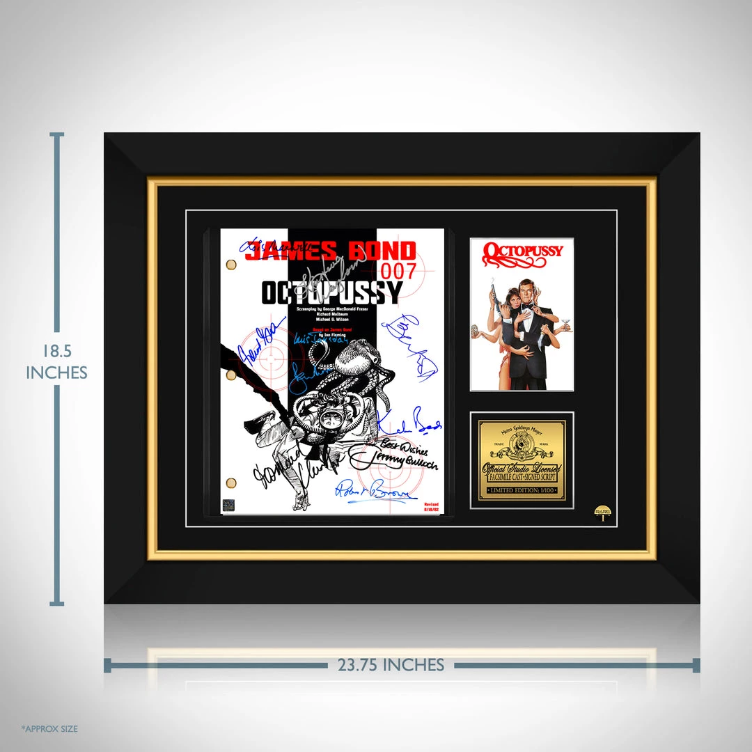 — Collector Grade Proprietary Exclusive VELVET TOUCH water/scratch resistant cover. — Collectible Facsimile of Original Hand-Signed James Bond Octopussy movie Script Custom Frame.
