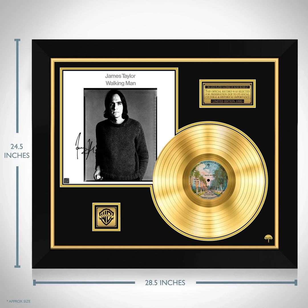 Pay homage to one of the best selling music artists of all time, James Taylor, with this gallery-framed, authentic, Warner Bros. Records fully licensed facsimile of the official Hand-Signed 24k Gold Plated LP Record and LP Cover Walking Man originally signed by singer-songwriter & guitarist, James Taylor, of which is strictly limited to 100 units Worldwide and has been approved and numbered accordingly.