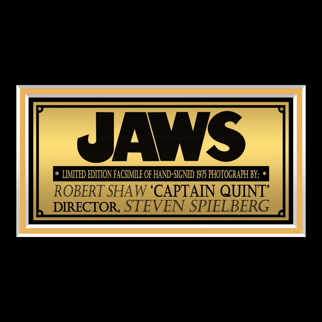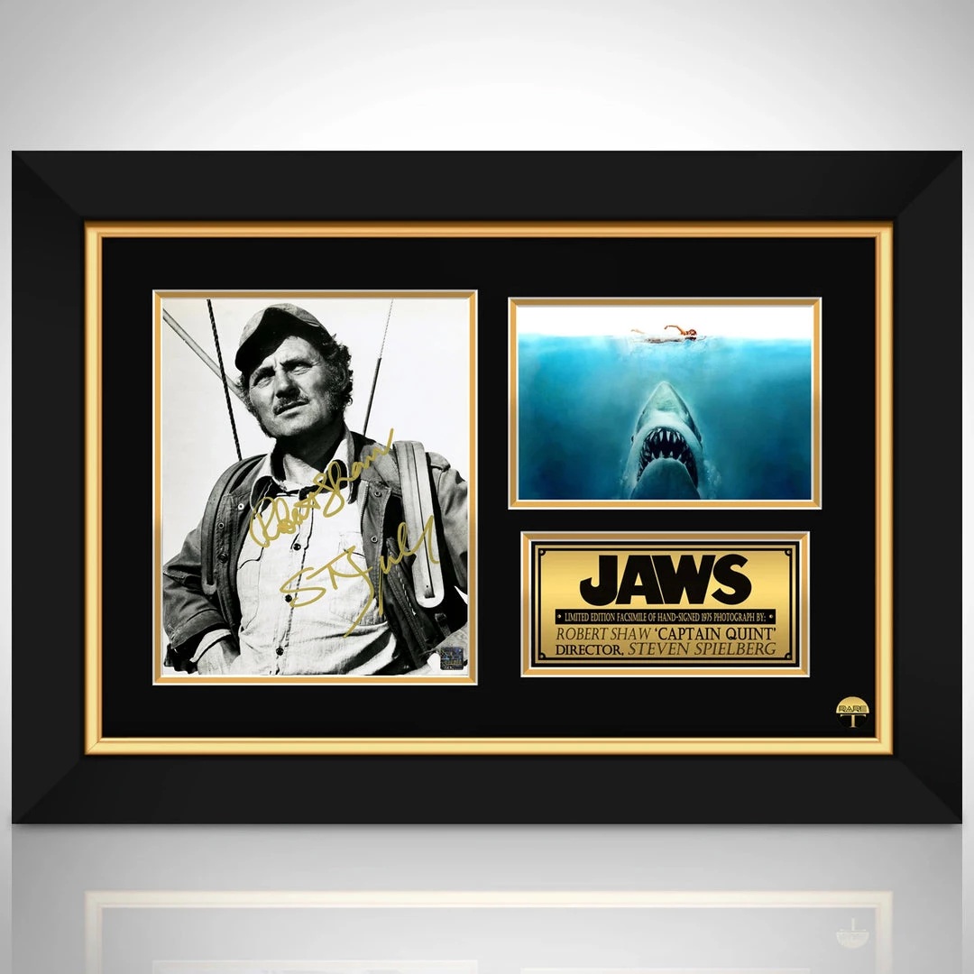 Pay homage to one of the highest grossing and best thrillers of all time, Jaws, with this gallery-framed, officially licensed, limited edition facsimile of the Hand-Signed photo, originally signed by legendary actor, the late Robert Shaw & legendary film producer, director & screenwriter, Steven Spielberg, of which is strictly limited to 100 units Worldwide, and has been approved and numbered accordingly.