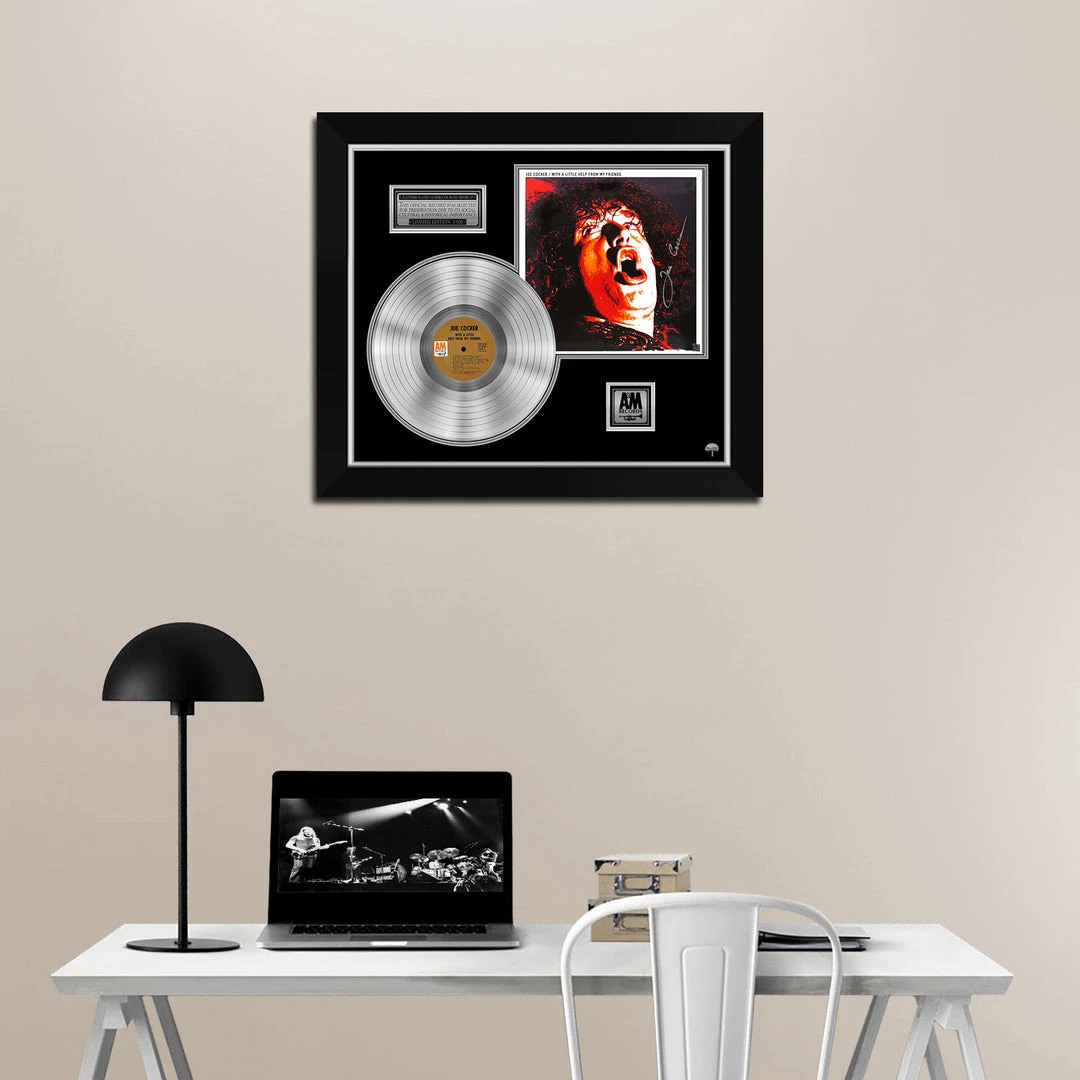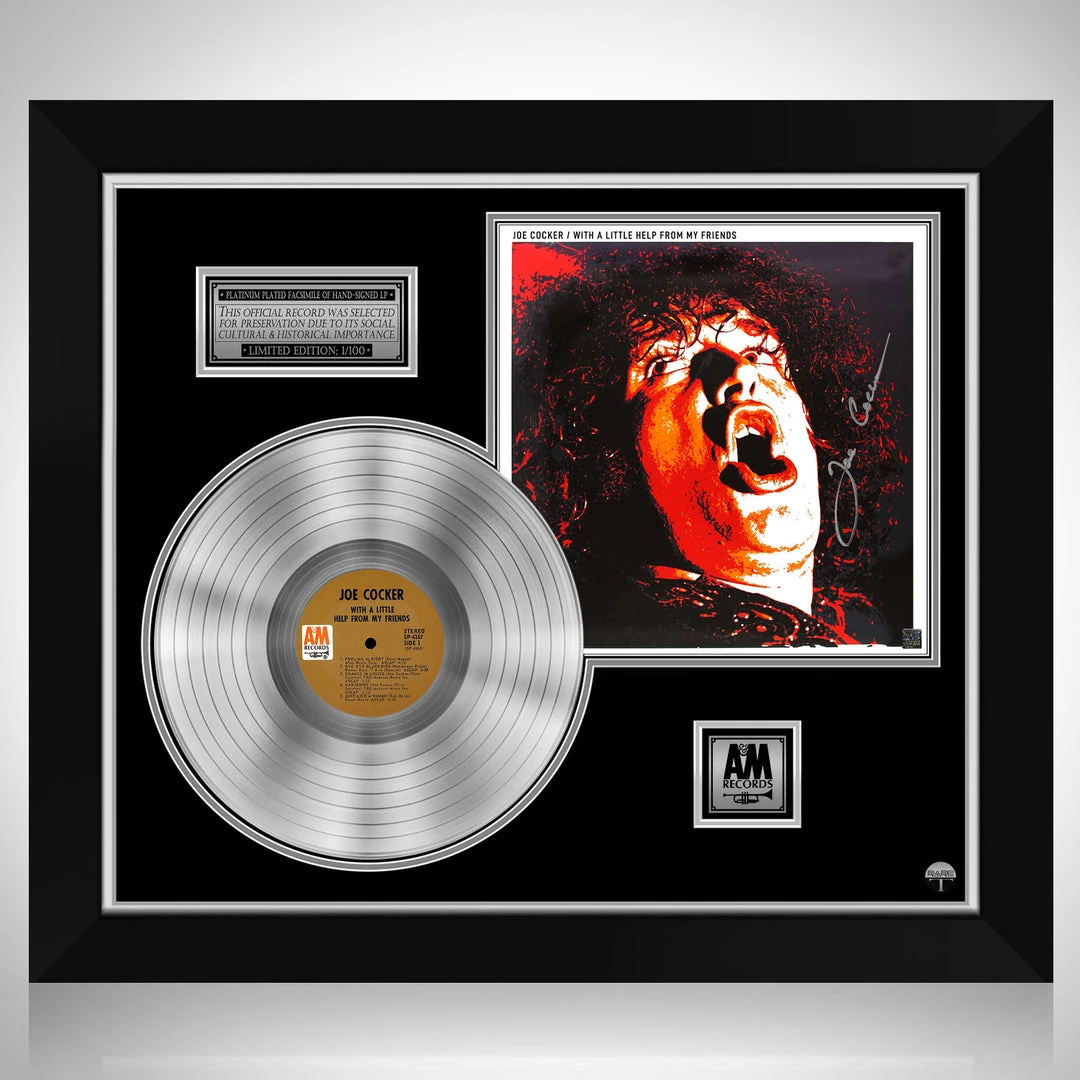 Pay homage to one of the most iconic English singer of all time Joe Cocker , with this gallery-framed, authentic AM Records fully licensed facsimile of the official Hand-Signed Platinum Plated LP Record and LP Cover With a little help from Friends Originally signed by Joe Cocker , of which is strictly limited to 100 units Worldwide and has been approved and numbered accordingly.