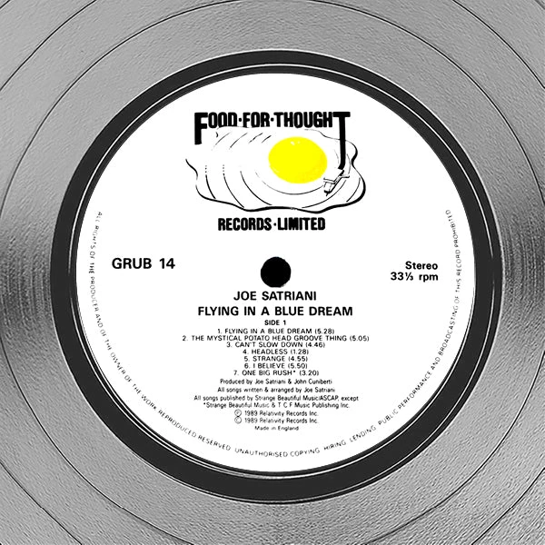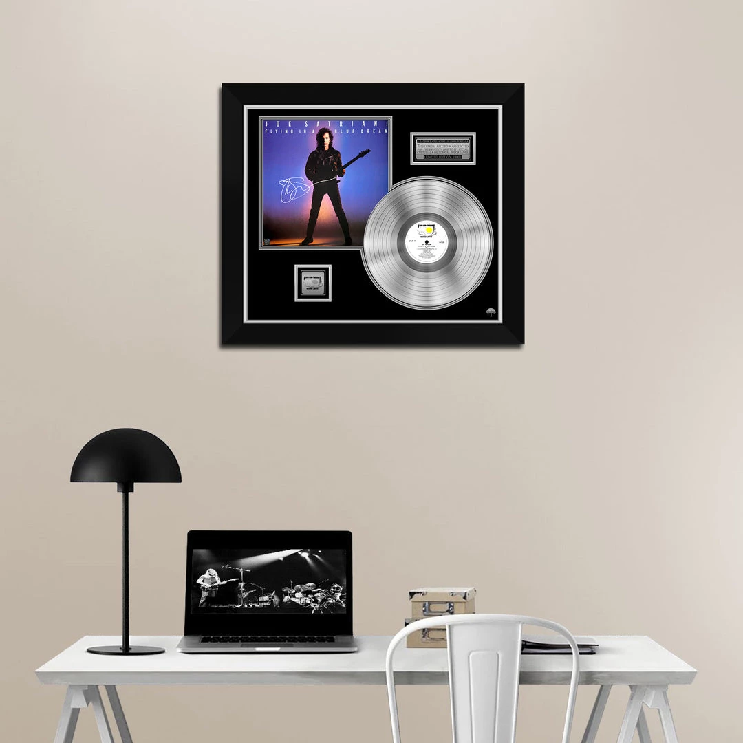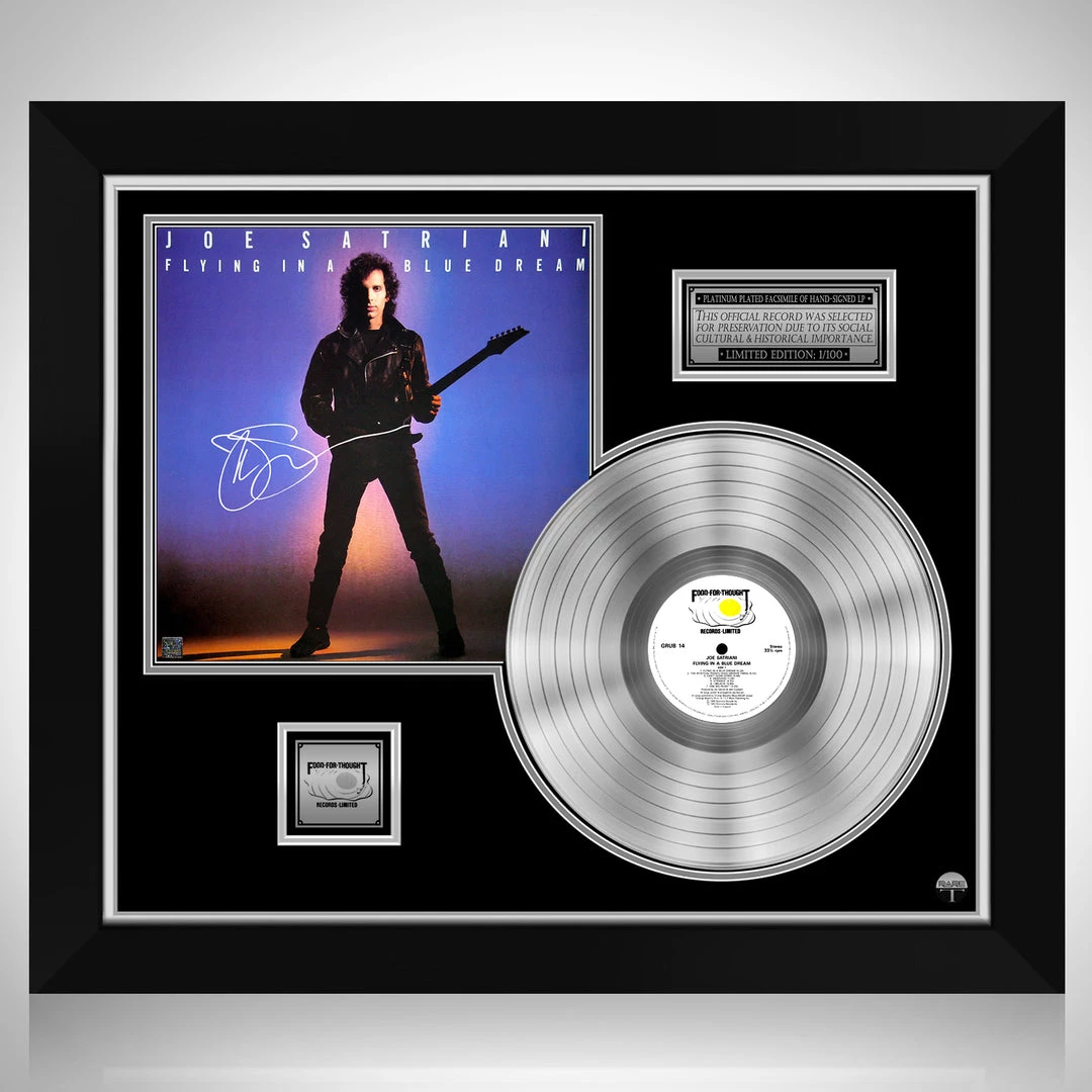 Pay homage to one of the most iconic American guitarist, composer, songwriter of all time Joe Satriani , with this gallery-framed, authentic Food for Thought Records fully licensed facsimile of the official Hand-Signed Platinum Plated LP Record and LP Cover Flying in a Blue dream Originally signed by Joe Satriani , of which is strictly limited to 100 units Worldwide and has been approved and numbered accordingly.