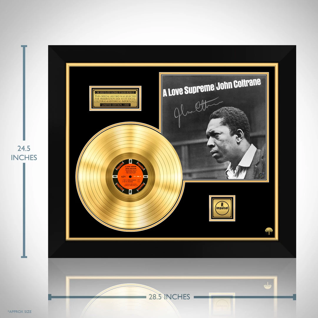 Pay homage to one of the most iconic American jazz saxophonist and composer of all time John Coltrane , with this gallery-framed, authentic Impulse! Records fully licensed facsimile of the official Hand-Signed 24K Gold LP Record and LP Cover A Love Supreme Originally signed by John Coltrane , of which is strictly limited to 100 units Worldwide and has been approved and numbered accordingly.