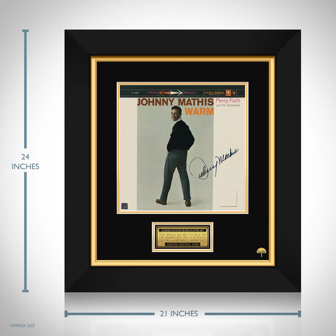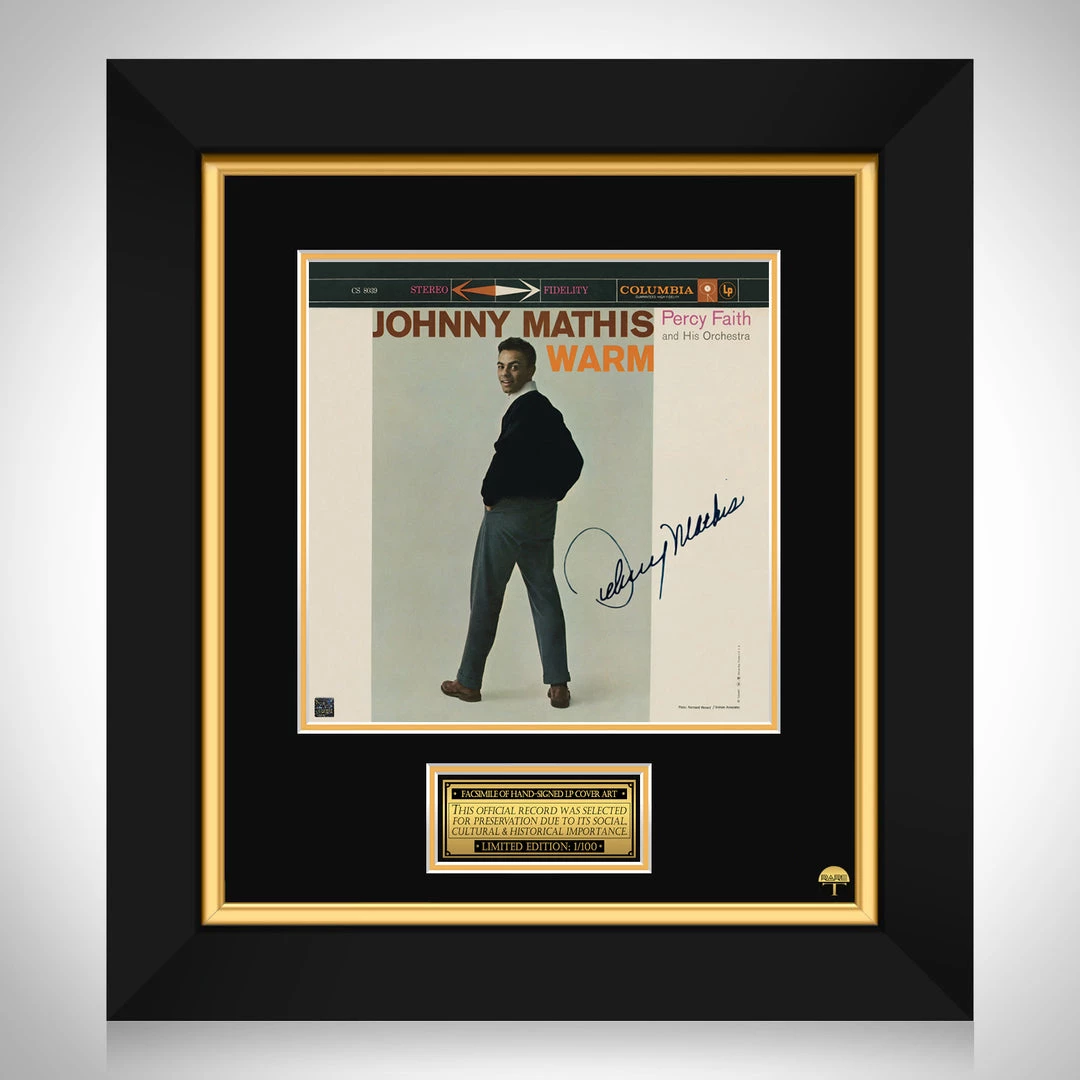 Pay homage to one of the most iconic American singer-songwriter of all time, Johnny Mathis , with this gallery-framed, officially licensed, limited edition facsimile of the Hand-Signed Warm LP Cover originally signed by Johnny Mathis , of which is strictly limited to 100 units Worldwide, and has been approved and numbered accordingly.