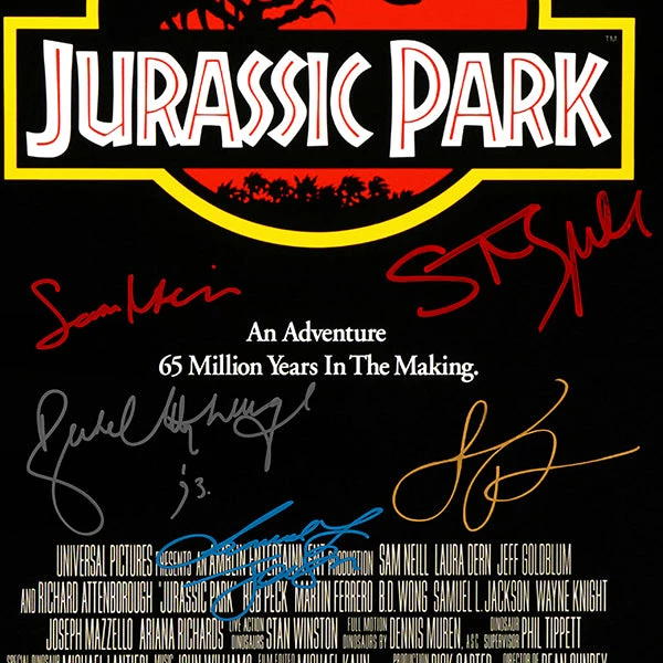 — Originally signed by Sam Neill, Samuel L. Jackson, Jeff Goldblum, Wayne Knight, Richard Attenborough, Laura Dern and legendary Director/Filmmaker Steven Spielberg.