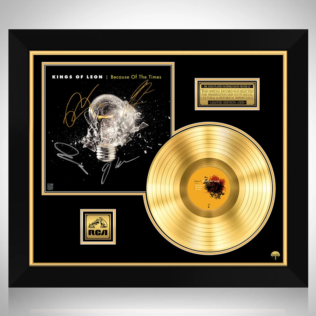 Pay homage to one of the most iconic American rock band of all time Kings of Leon , with this gallery-framed, authentic RCA Records fully licensed facsimile of the official Hand-Signed 24K Gold LP Record and LP Cover Because of the times Originally signed by Caleb Followill, Matthew Followill,Jared Followill & Nathan Followill , of which is strictly limited to 100 units Worldwide and has been approved and numbered accordingly.