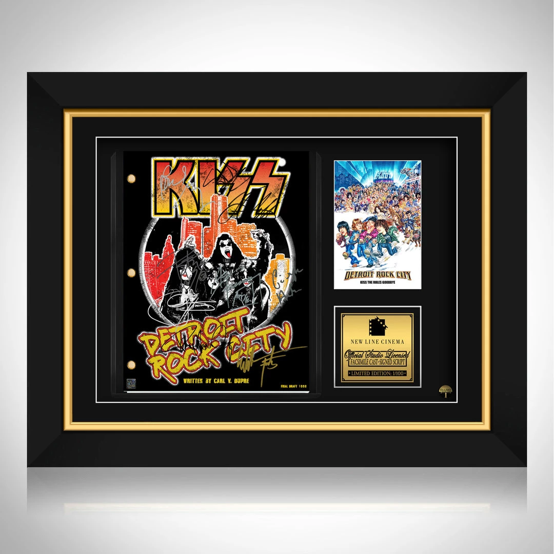 Pay homage to Detroit Rock City , with this New Line Cinema fully licensed facsimile of the official signed movie script, originally signed by actors Giuseppe Andrews, James DeBello, Edward Furlong, Sam Huntington, Gene Simmons, Paul Stanley, Ace Frehley, Peter Criss & Ron Jeremy , of which is strictly limited to 100 units Worldwide and has been approved and numbered accordingly.