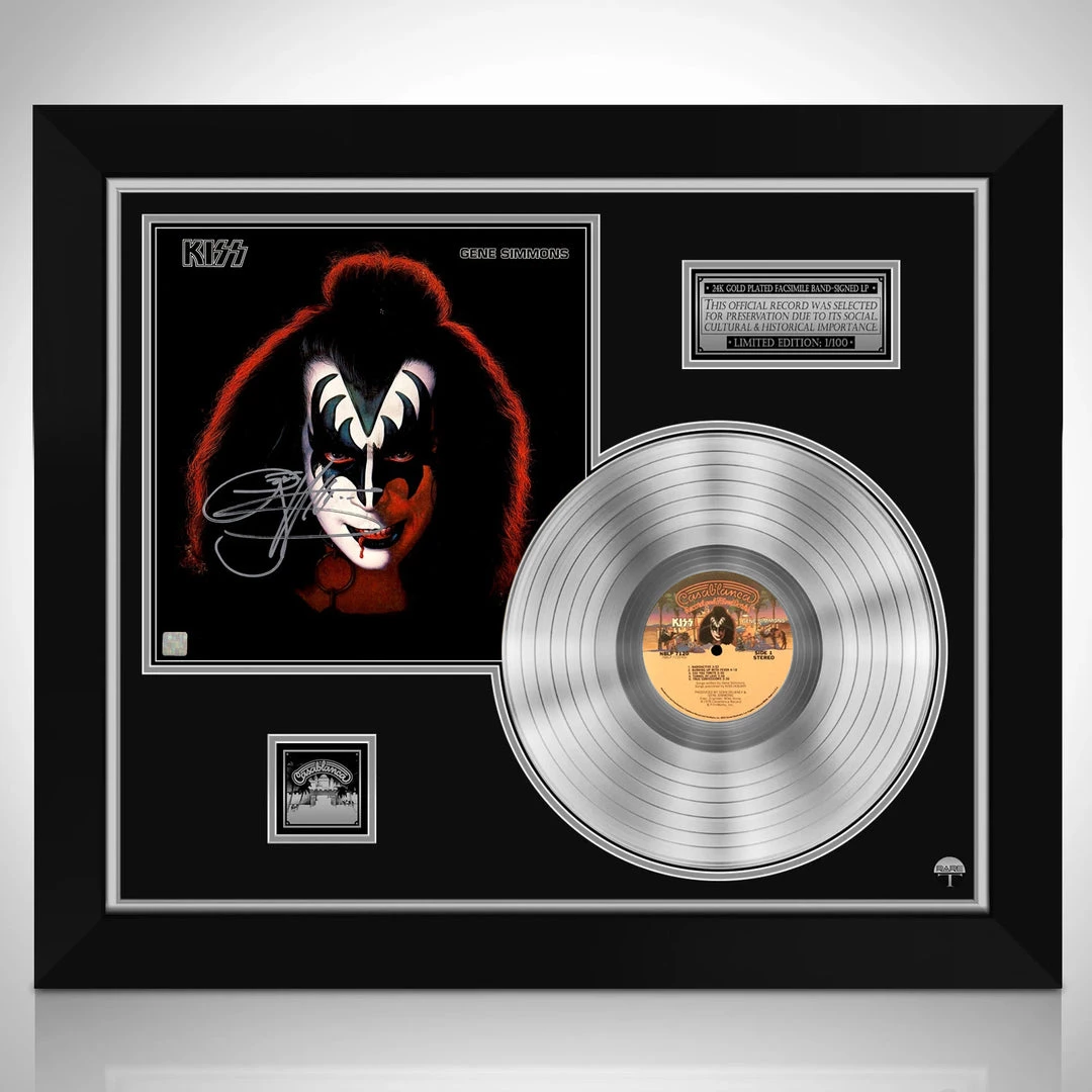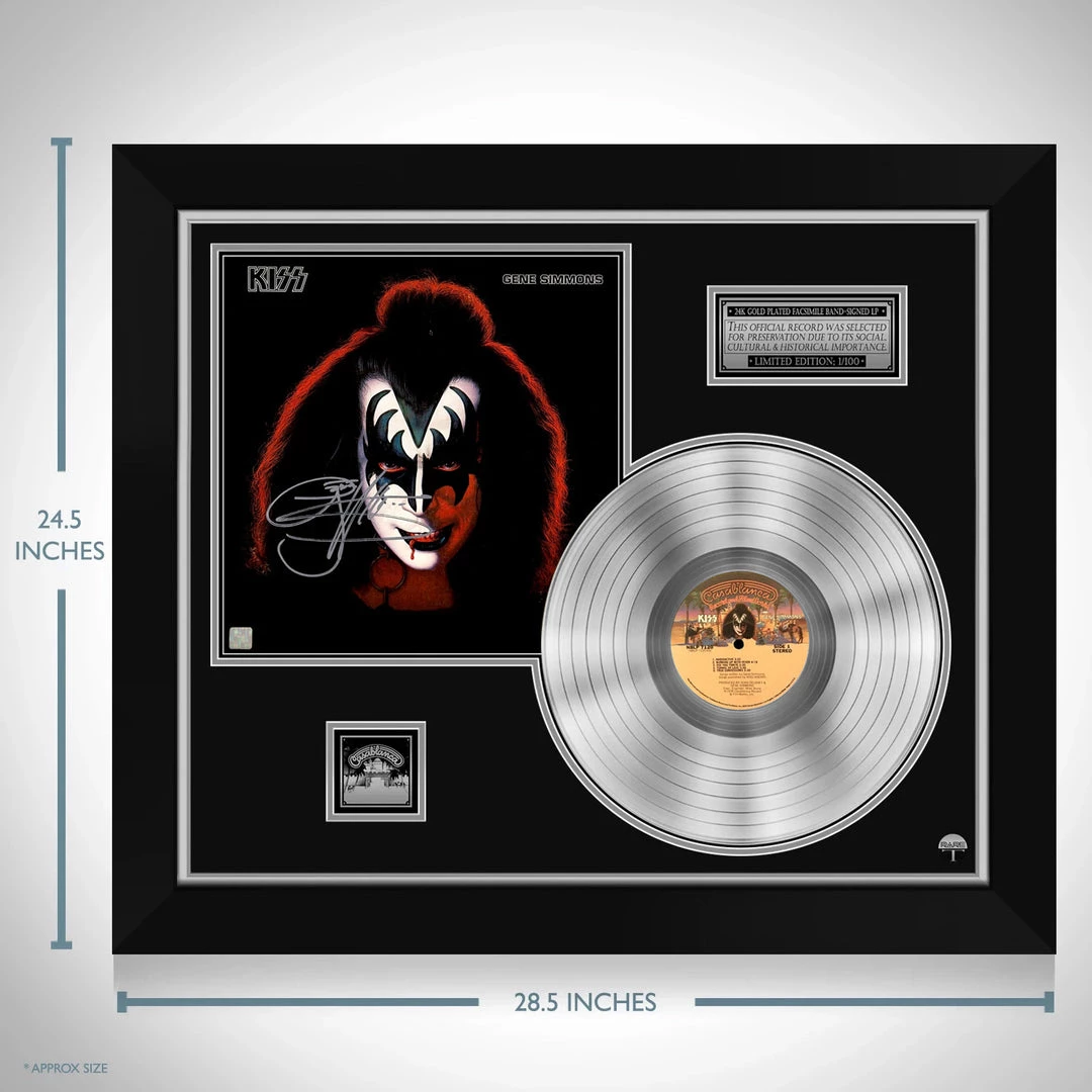 Pay homage to the ‘Demon’ Gene Simmons and one of the world’s best selling and most influential rock bands of all time, KISS, with this gallery-framed, authentic, Casablanca Records fully licensed facsimile of the official Hand-Signed Platinum Plated LP Record and LP Cover Gene Simmons Solo Album originally signed by the legendary musician, singer-songwriter, record producer, actor, entrepreneur Gene Simmons, of which is strictly limited to 100 units Worldwide and has been approved and numbered accordingly.