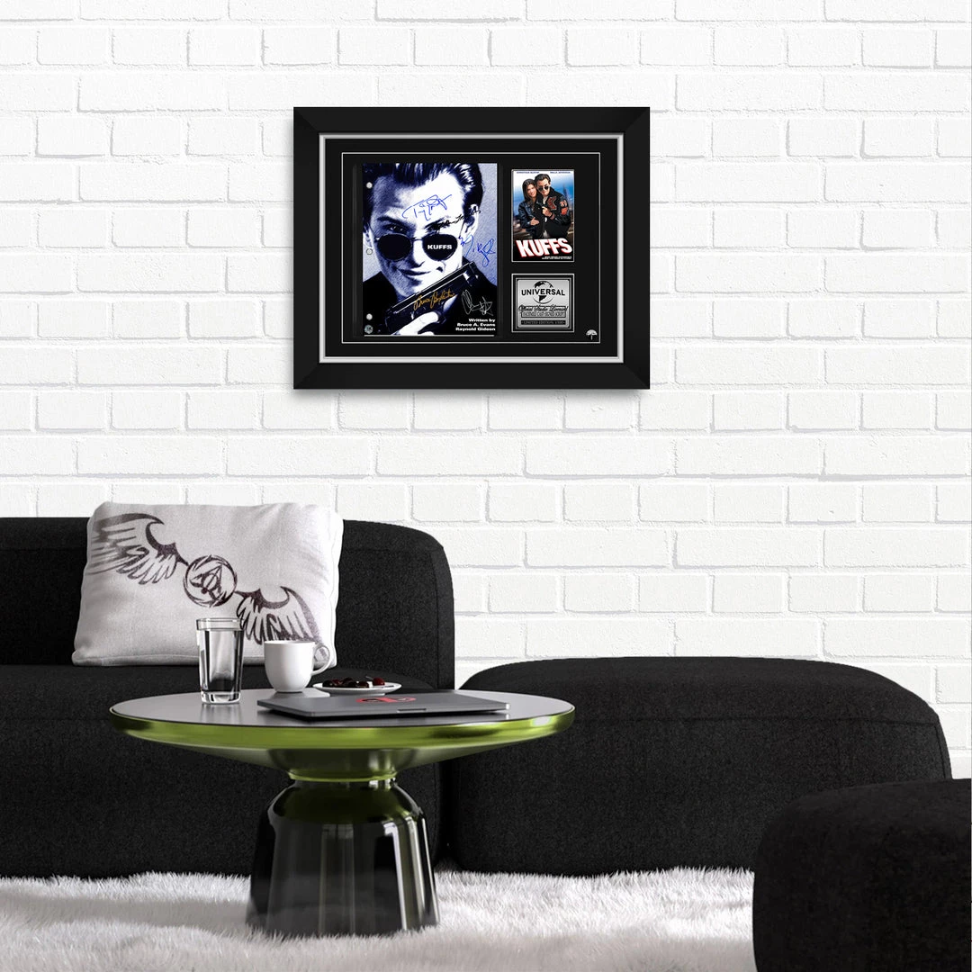 Pay homage to Kuffs , with this Universal Pictures fully licensed facsimile of the official signed movie Transcript , originally signed by actors Christian Slater, Tony Goldwyn, Milla Jovovich, Bruce Boxleitner & Mary Ellen Trainor , of which is strictly limited to 100 units Worldwide and has been approved and numbered accordingly.