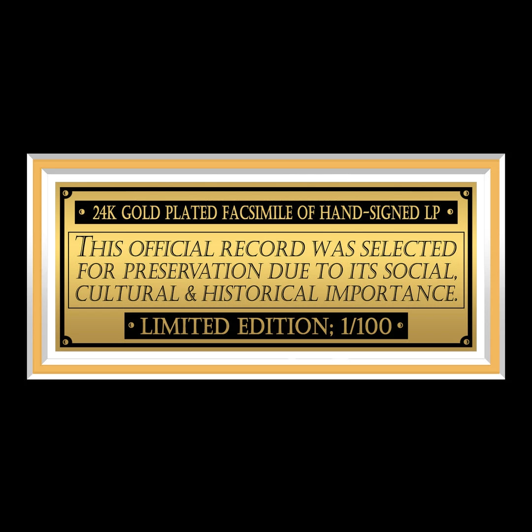 The 24k Gold Plated LP and album cover facsimile are both professionally mounted in the highest quality triple matted wood shadow box frame with metallic fillet trim and finished with protective glass to keep it looking pristine. The customized descriptive metallic plaque, in addition to the detailed finishing and openings, add to the elegant and sophisticated gallery quality look.