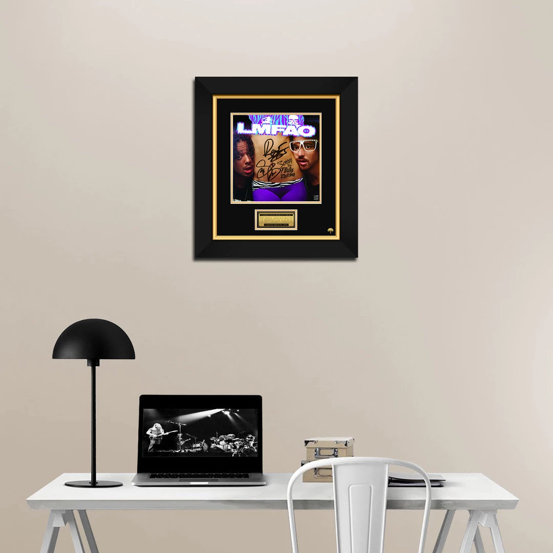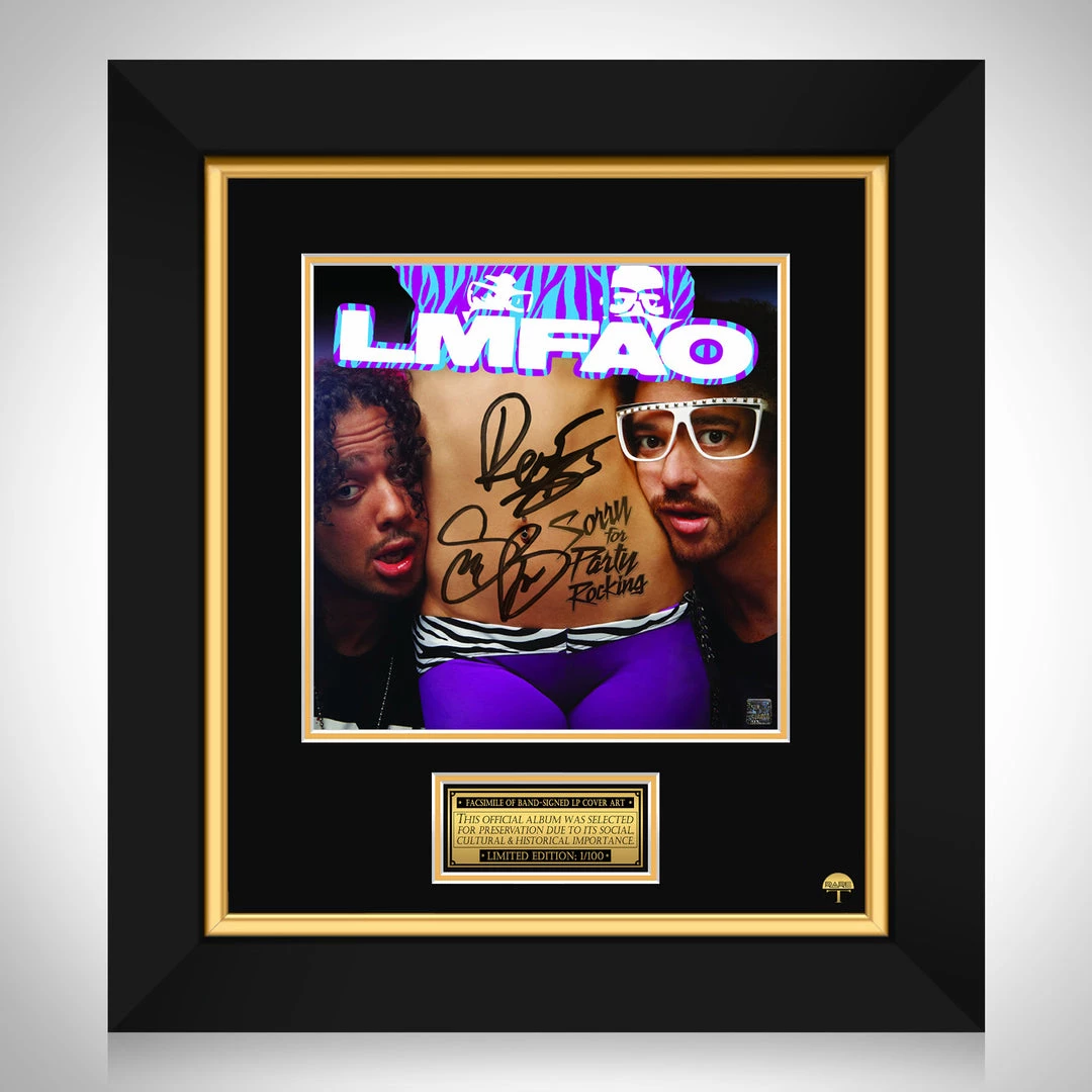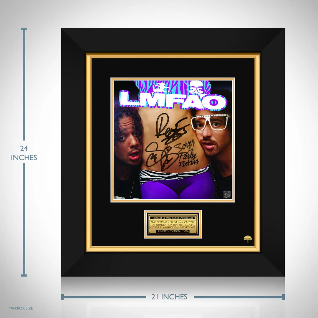 Pay homage to one of the most iconic electronic dance music duo of all time, LMFAO , with this gallery-framed, officially licensed, limited edition facsimile of the Hand-Signed Sorry for Party Rocking LP Cover originally signed by Stephen Kendal Gordy “RedFoo” & Skyler Austen Gordy “Sky Blu” , of which is strictly limited to 100 units Worldwide, and has been approved and numbered accordingly.