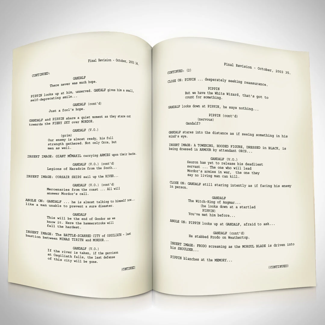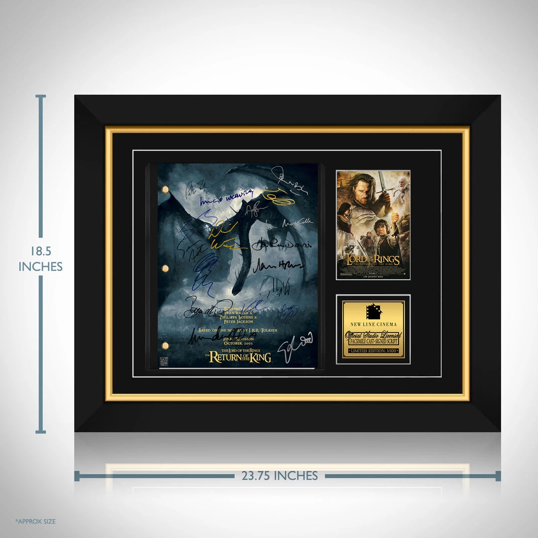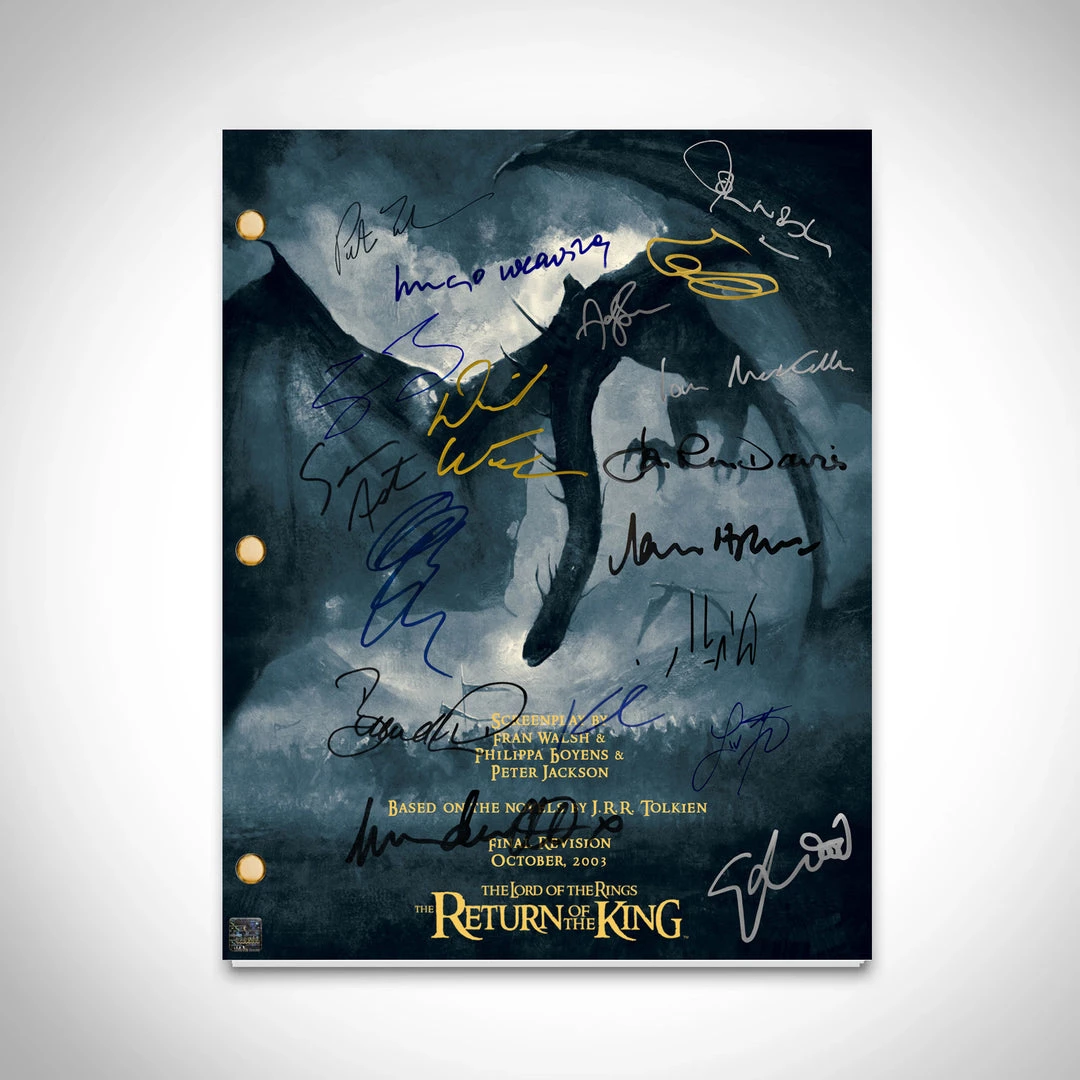 Pay homage to Lord of the Rings The Return of the King , with this New Line Cinema fully licensed facsimile of the official signed movie script, originally signed by actors Peter Jackson, Elijah Wood, Ian McKellen, Liv Tyler, Viggo Mortensen, Sean Astin, Cate Blanchette, John Rhys-Davies, Bernard Hill, Dominic Monaghan, Orlando Bloom, Hugo Weaving, Miranda Otto, David Wenham, Karl Urban, John Noble, Andy Serkis, Ian Holm & Sean Bean , of which is strictly limited to 100 units Worldwide and has been approved and numbered accordingly.