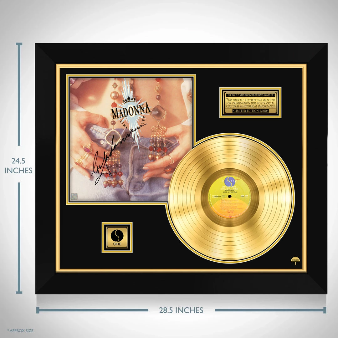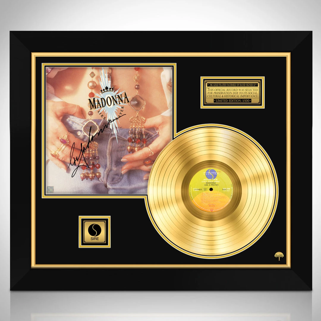 Pay homage to the “Queen of Pop”, Madonna, with this gallery-framed, authentic, Sire Records fully licensed facsimile of the official Hand-Signed 24k Gold Plated LP Record and LP Cover Like a Prayer, Originally signed by singer-songwriter, actress, producer, & dancer, the legendary Madonna, of which is strictly limited to 100 units Worldwide and has been approved and numbered accordingly.