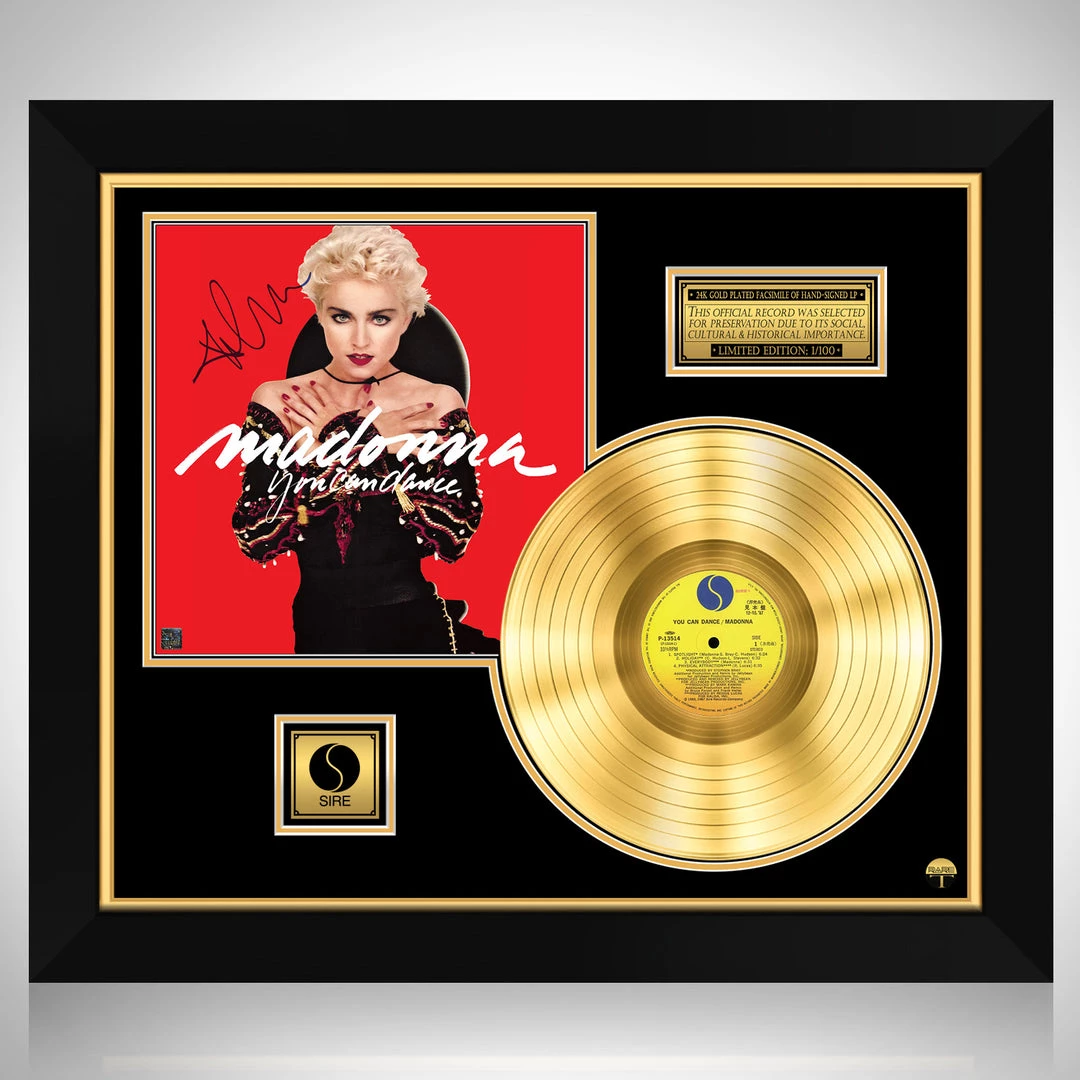 Pay homage to one of the most iconic American singer, songwriter of all time Madonna , with this gallery-framed, authentic Sire Records fully licensed facsimile of the official Hand-Signed 24K Gold LP Record and LP Cover You can dance Originally signed by Madonna , of which is strictly limited to 100 units Worldwide and has been approved and numbered accordingly.