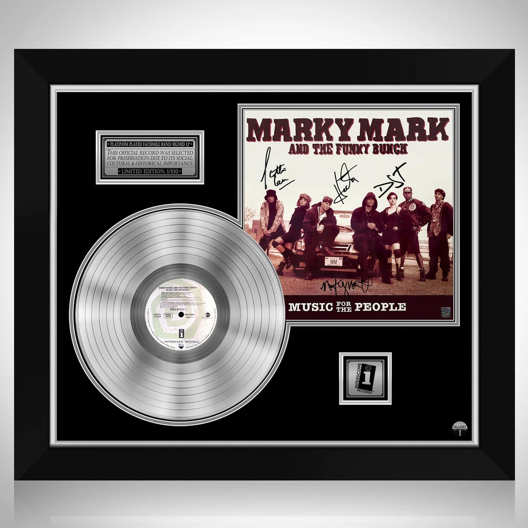 Pay homage to one of the most iconic American hip-hop group of all time Marky Mark and the Funky Bunch , with this gallery-framed, authentic Interscope Records fully licensed facsimile of the official Hand-Signed Platinum Plated LP Record and LP Cover Music to the People Originally signed by Marky Mark (Mark Wahlberg), Scottie Gee (Scott Ross), DJ-T (Terry Yancey and Hector Barros , of which is strictly limited to 100 units Worldwide and has been approved and numbered accordingly.