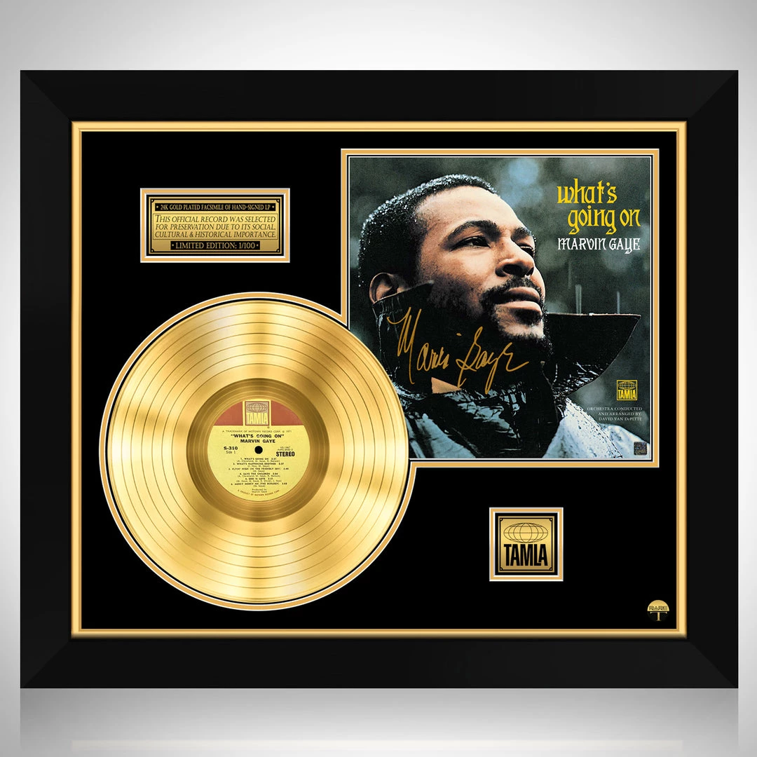 Pay homage to one of the most iconic American singer, songwriter of all time Marvin Gaye , with this gallery-framed, authentic Tamla records fully licensed facsimile of the official Hand-Signed 24K Gold LP Record and LP Cover What’s going on Originally signed by Marvin Gaye , of which is strictly limited to 100 units Worldwide and has been approved and numbered accordingly.