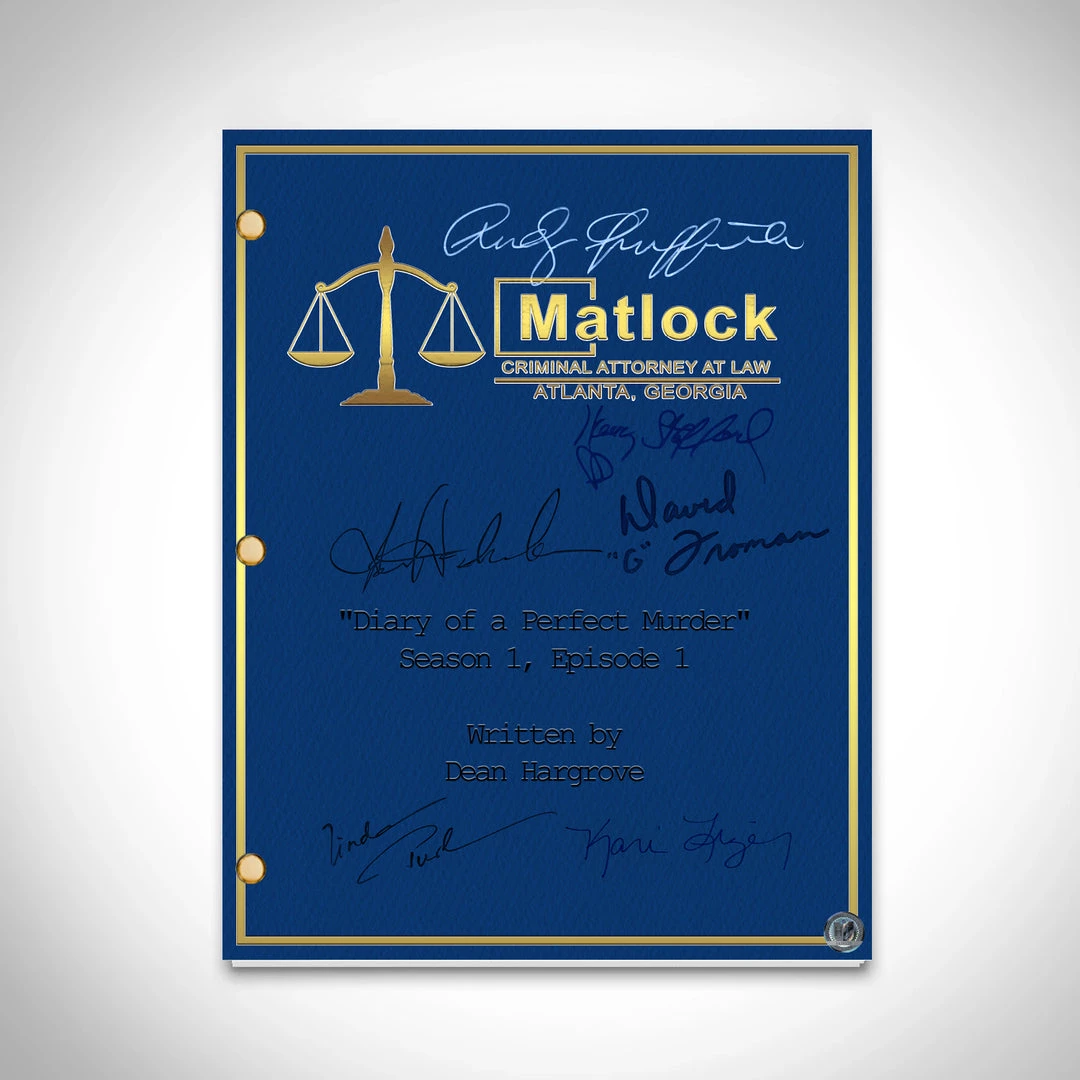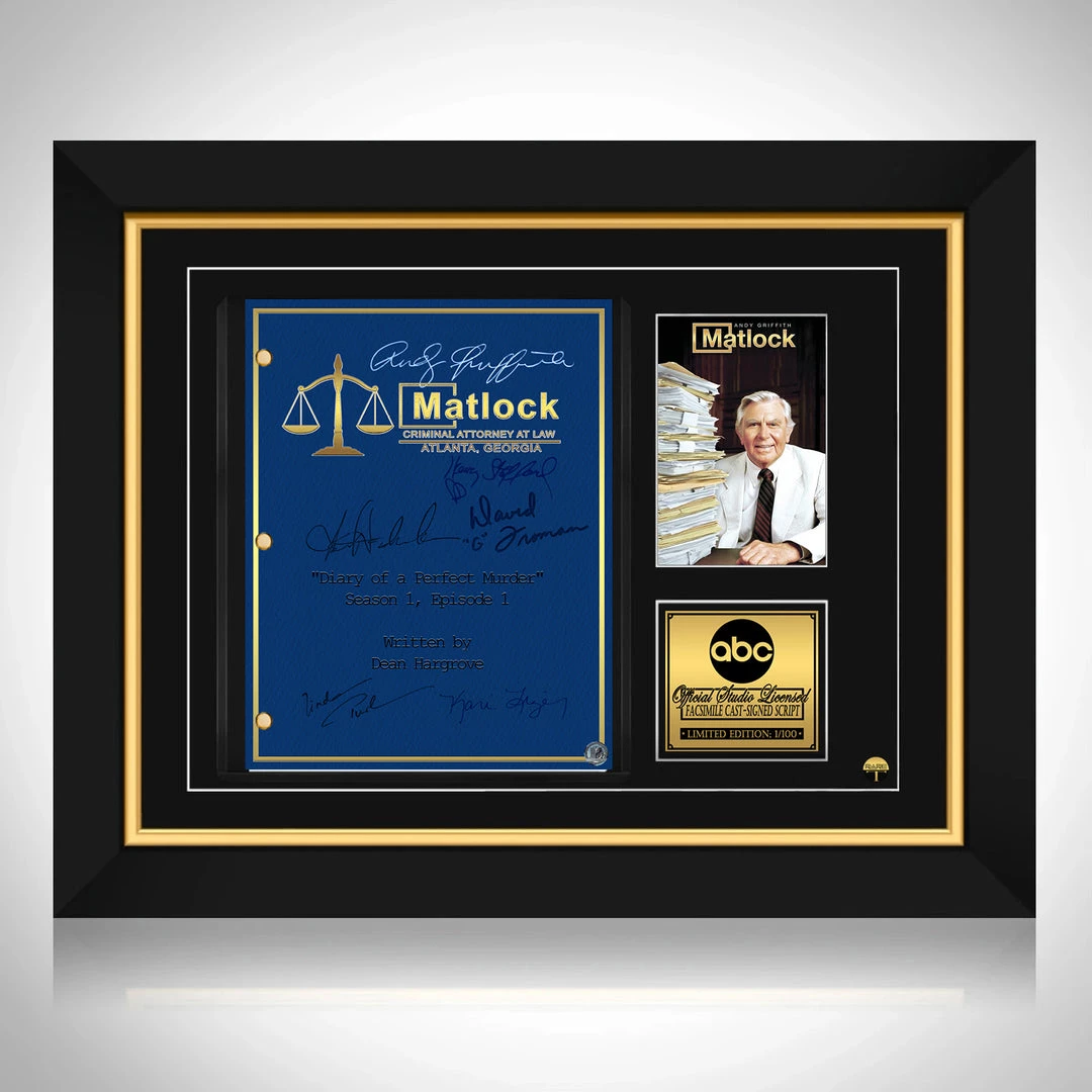 Pay homage to Matlock , with this ABC fully licensed facsimile of the official signed TV Series transcript, originally signed by actors Andy Griffith, Nancy Stafford, Kene Holliday, Kari Lizer & Linda Purl , of which is strictly limited to 100 units Worldwide and has been approved and numbered accordingly.