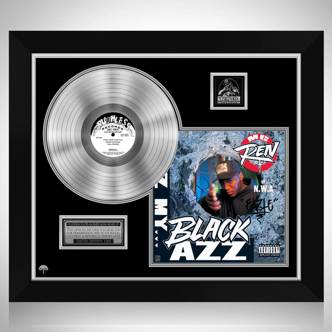 Pay homage to one of the most iconic American rapper, songwriter of all time MC Ren , with this gallery-framed, authentic Priority Records fully licensed facsimile of the official Hand-Signed Platinum Plated LP Record and LP Cover Kizz my Black Azz Originally signed by MC Ren & Eazy-E , of which is strictly limited to 100 units Worldwide and has been approved and numbered accordingly.
