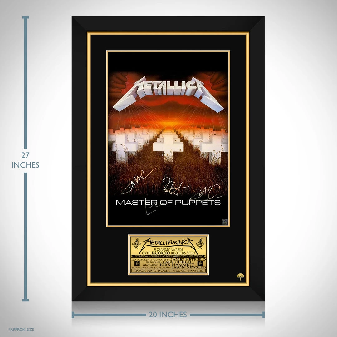 Pay homage to Metallica, with this gallery-framed, officially licensed, limited edition facsimile of hand-signed mini poster, originally signed by Kirk Hammett, Lars Ulrich, James Hetfield & Jason Newsted, of which is strictly limited to 100 units Worldwide, and has been approved and numbered accordingly.