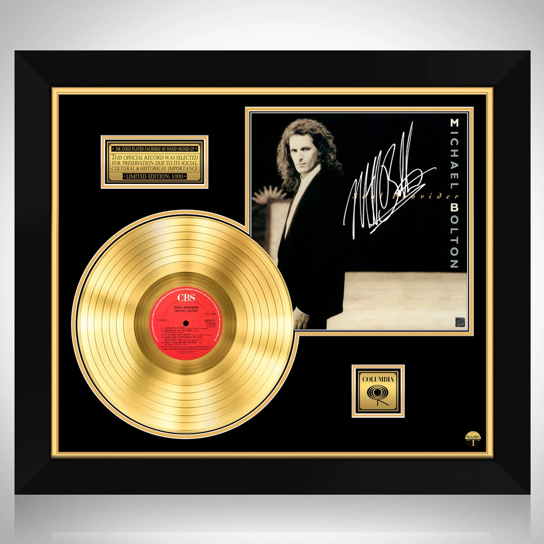 Pay homage to one of the most iconic American singer and songwriter of all time Michael Bolton , with this gallery-framed, authentic Columbia Records fully licensed facsimile of the official Hand-Signed 24K Gold LP Record and LP Cover Soul Provider Originally signed by Michael Bolton , of which is strictly limited to 100 units Worldwide and has been approved and numbered accordingly.