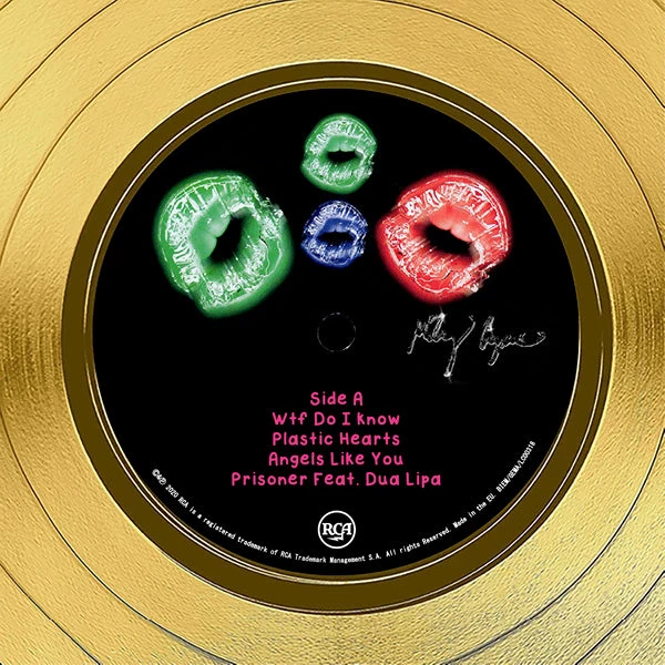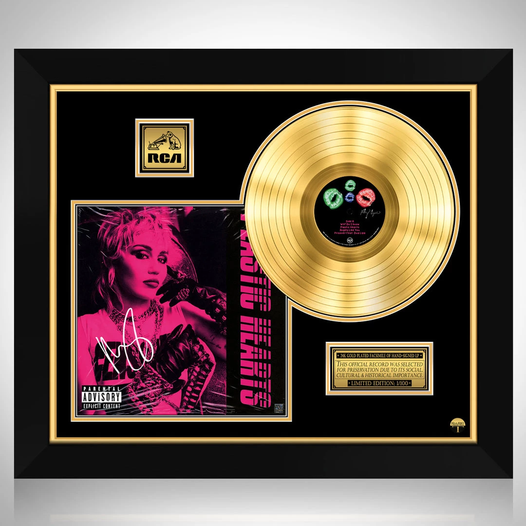 Pay homage to one of the most iconic American singer, songwriter of all time Miley Cyrus , with this gallery-framed, authentic RCA Records fully licensed facsimile of the official Hand-Signed 24K Gold LP Record and LP Cover Plastic Hearts Originally signed by Miley Cyrus , of which is strictly limited to 100 units Worldwide and has been approved and numbered accordingly.