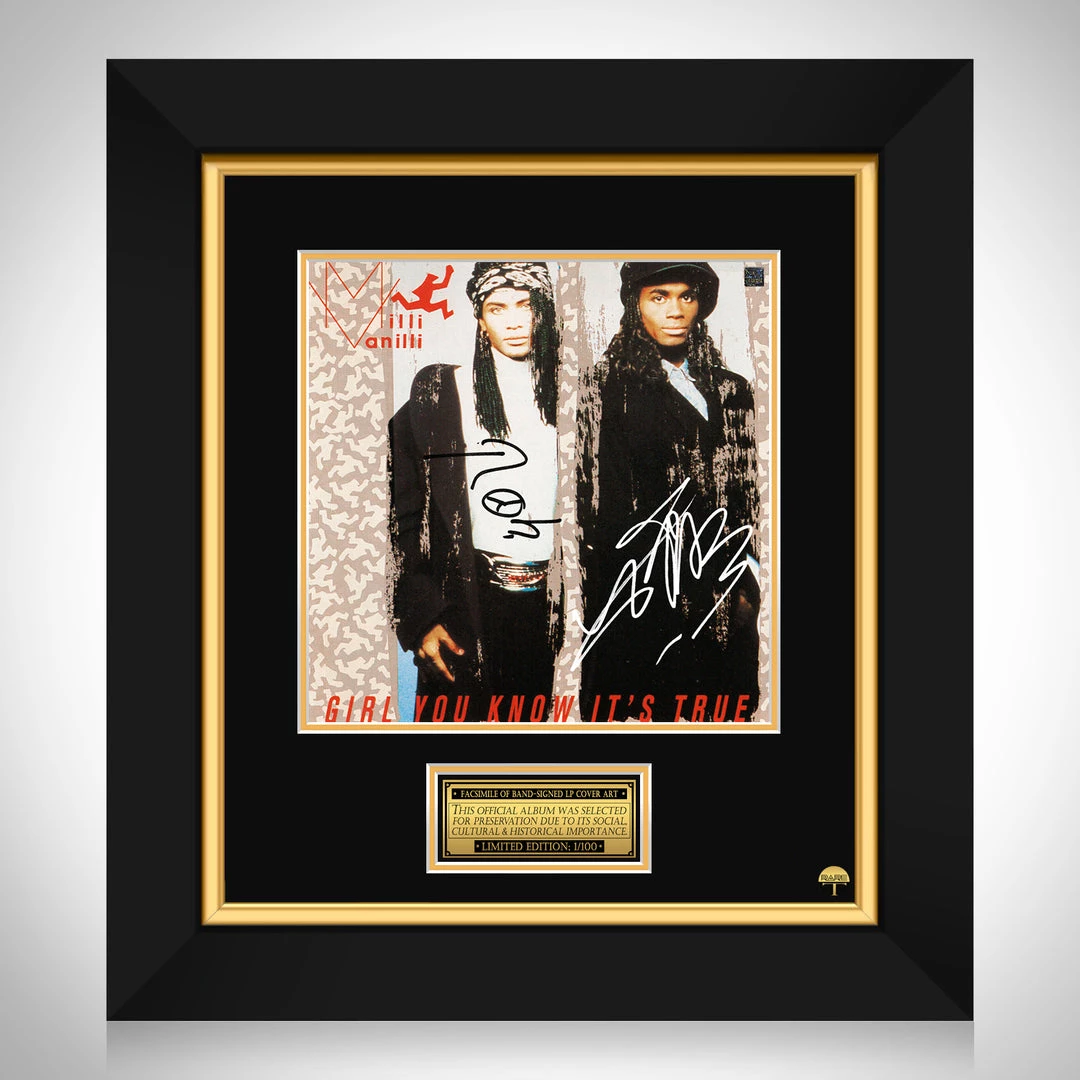 Pay homage to one of the most iconic German-French R&B duo of all time, Milli Vanilli , with this gallery-framed, officially licensed, limited edition facsimile of the Hand-Signed Girl you know it’s true LP Cover originally signed by Fab Morvan & Rob Pilatus , of which is strictly limited to 100 units Worldwide, and has been approved and numbered accordingly.