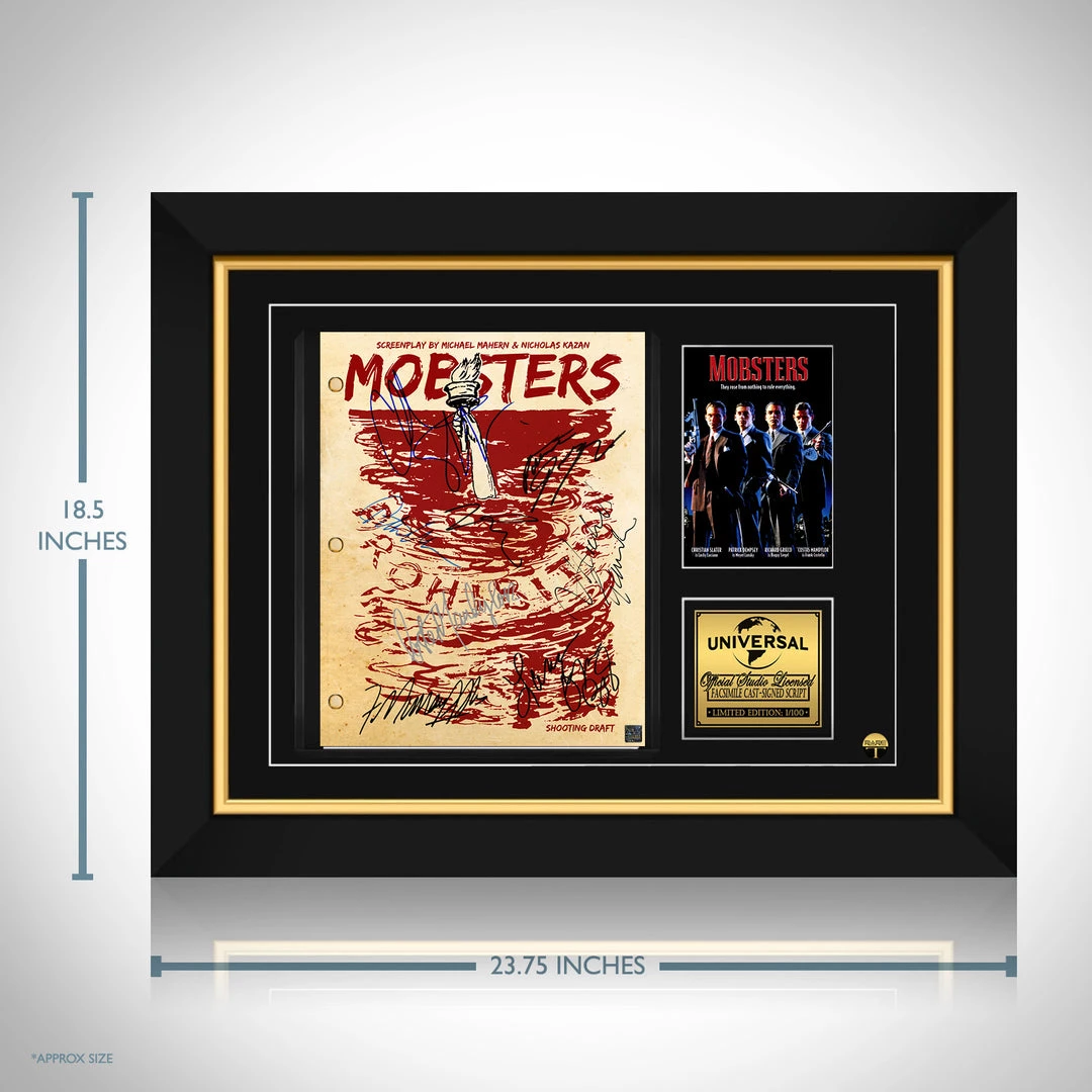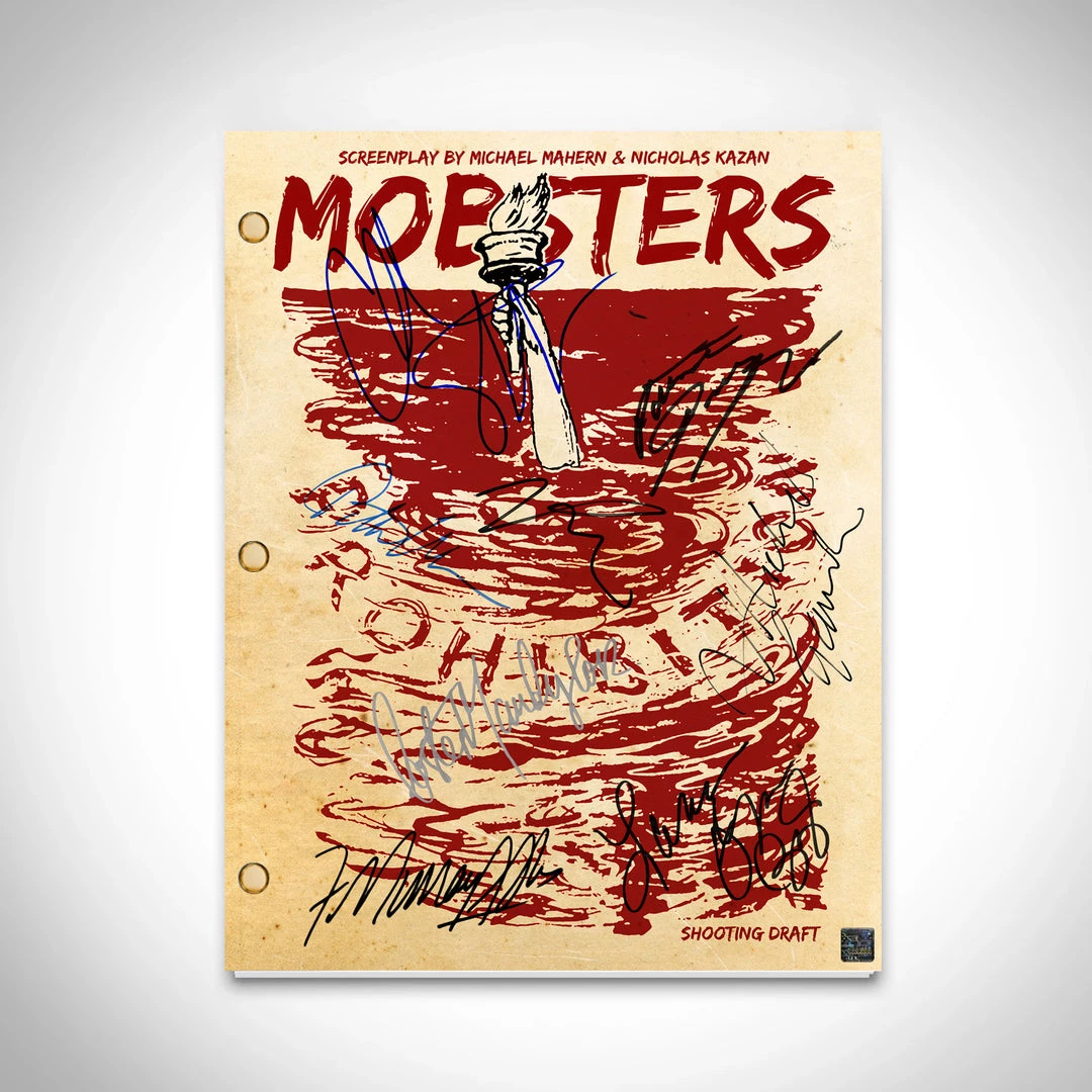 Pay homage to Mobsters , with this Universal Pictures fully licensed facsimile of the official signed movie script, originally signed by actors Christian Slater, Patrick Dempsey, Richard Grieco, Costas Mandylor, F.Murray Abraham, Lara Flynn Boyle, Michael Gambon, Anthony Quinn & Titus Welliver , of which is strictly limited to 100 units Worldwide and has been approved and numbered accordingly.
