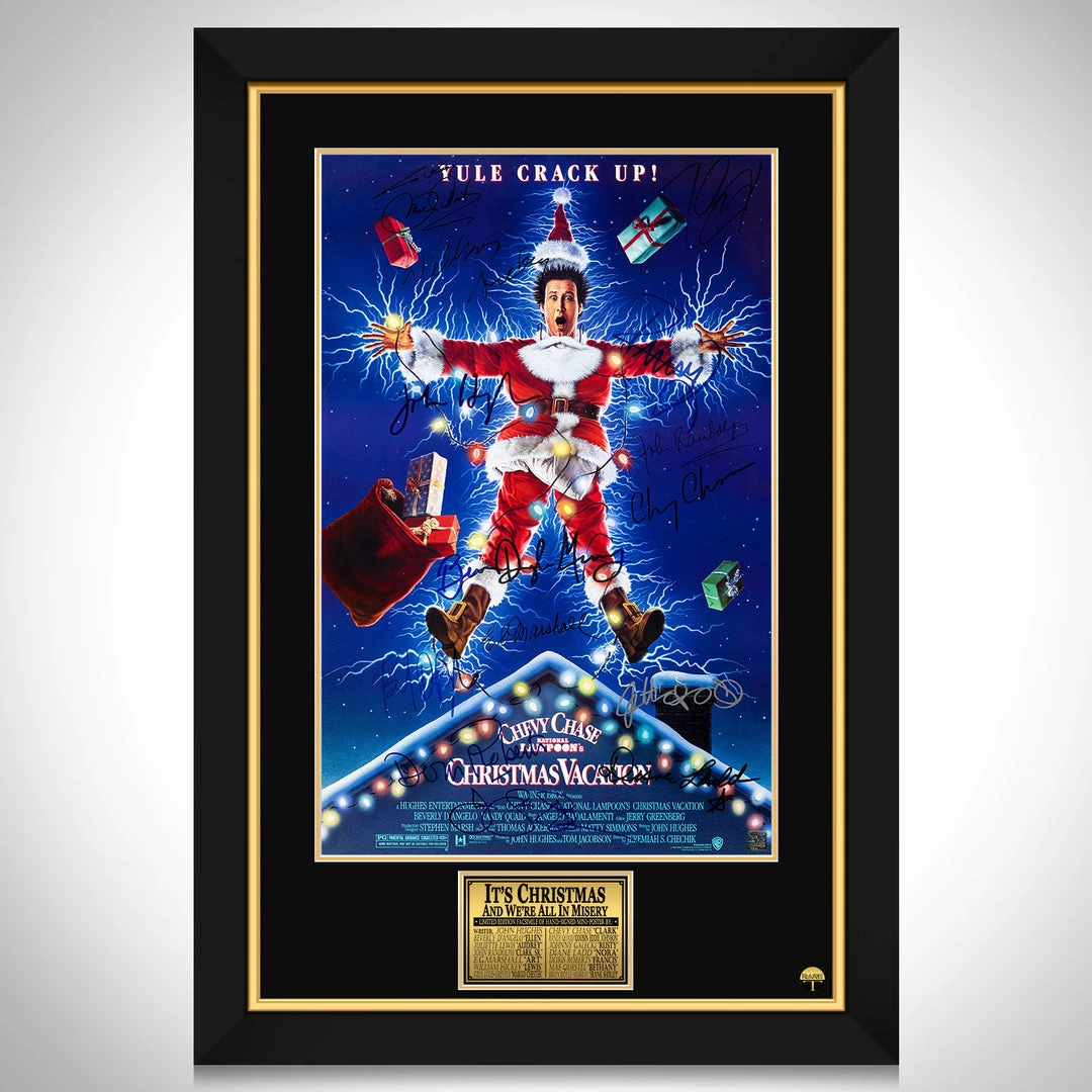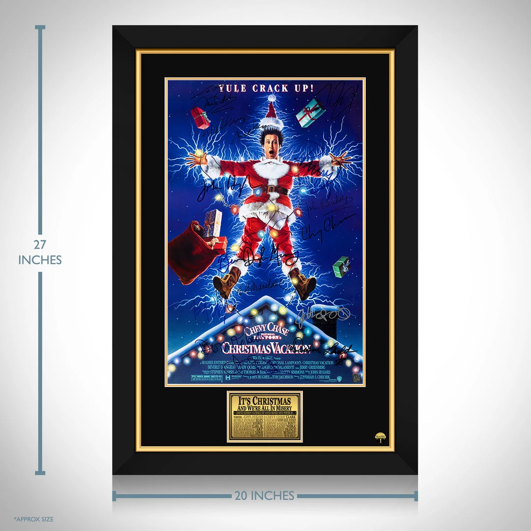 Pay homage to one of the most iconic films of all time, National Lampoon’s Christmas Vacation, with this gallery-framed, officially licensed, limited edition facsimile of hand-signed movie mini poster, originally signed by John Hughes, Chevy Chase, Beverly D’Angelo, Randy Quaid, Juliette Lewis, Johnny Galecki, John Randolph, Diane Ladd, E.G.Marshall, Doris Roberts, William Hickey, Mae Questel, Julia Louis-Dreyfus & Brian Doyle-Murray, of which is strictly limited to 100 units Worldwide, and has been approved and numbered accordingly.
