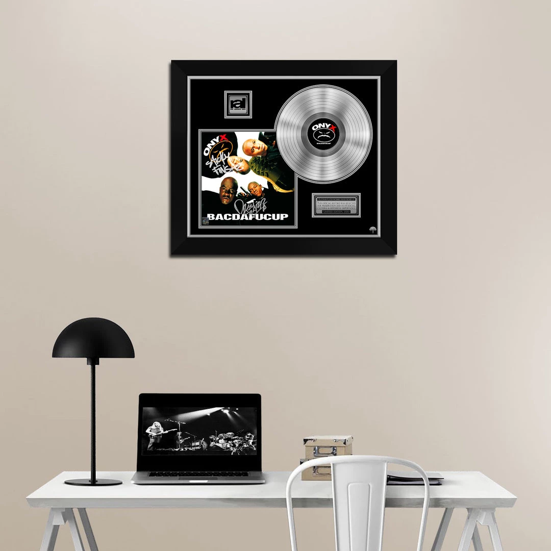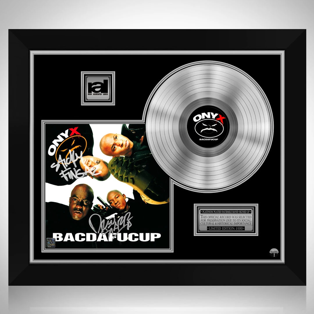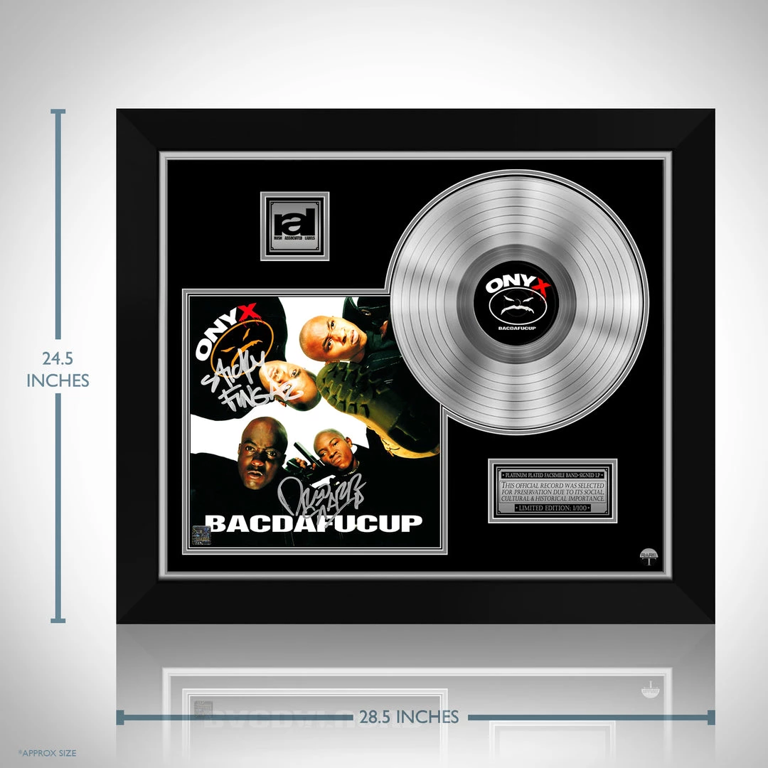 Pay homage to one of the most iconic hip hop group of all time Onyx , with this gallery-framed, authentic Rush Associated Labels fully licensed facsimile of the official Hand-Signed Platinum Plated LP Record and LP Cover Bacdafucup Originally signed by Sticky Fingaz & Freddo Starr , of which is strictly limited to 100 units Worldwide and has been approved and numbered accordingly.