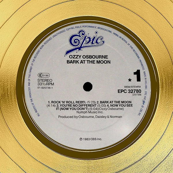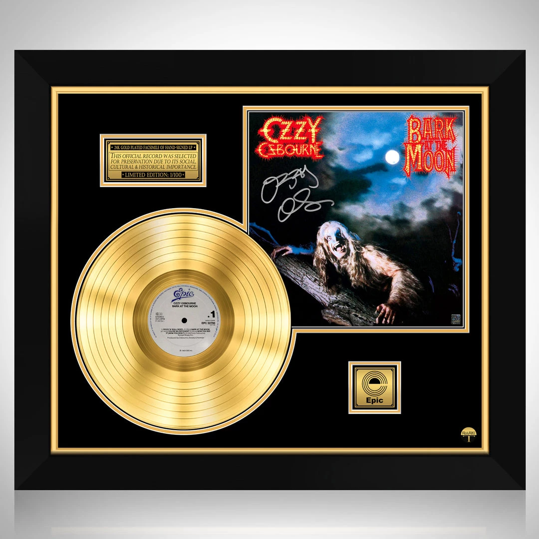 Pay homage to one of the Prince of Darkness of all time Ozzy Osbourne , with this gallery-framed, authentic Epic Records fully licensed facsimile of the official Hand-Signed 24K Gold LP Record and LP Cover Bark at the Moon Originally signed by Ozzy Osbourne , of which is strictly limited to 100 units Worldwide and has been approved and numbered accordingly.