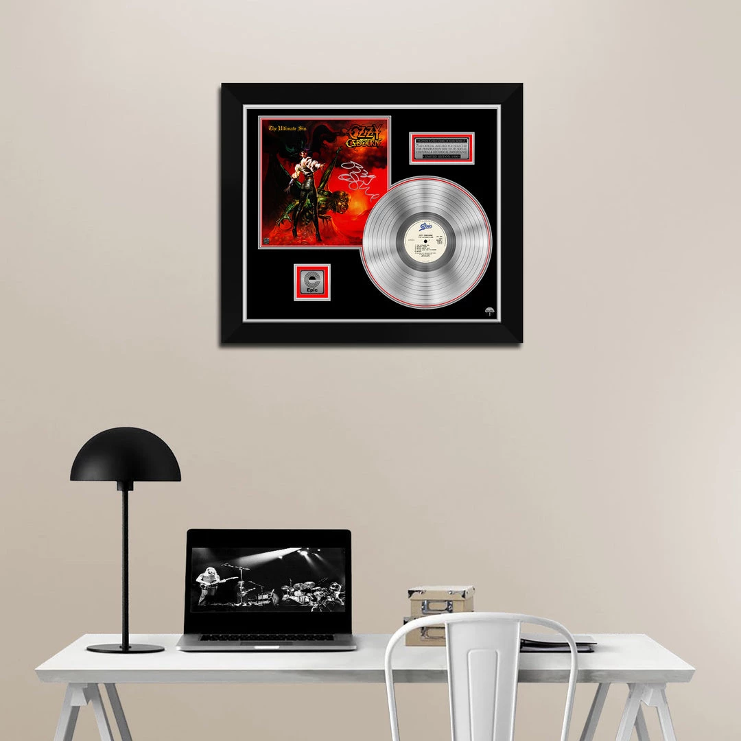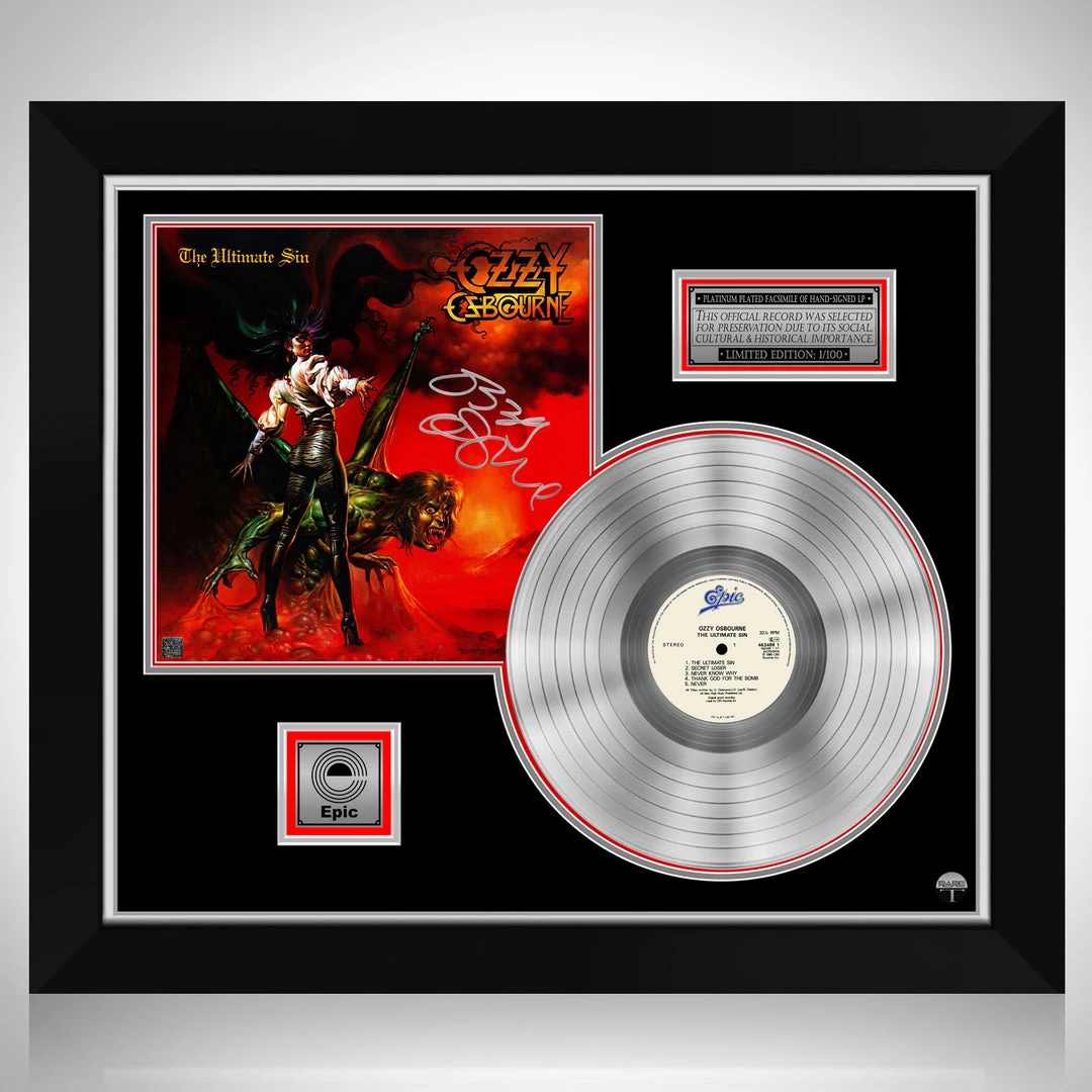 Pay homage to The Prince of Darkness,ย Ozzy Osbourne, with this gallery-framed, authentic Epicย Records fully licensed facsimile of the official Hand-Signed Platinumย LP Record and LP Cover Ultimate Sinย Originally signed byย Ozzy Osbourneย ,ย of which is strictly limited toย 100 units Worldwideย and has been approved and numbered accordingly.
