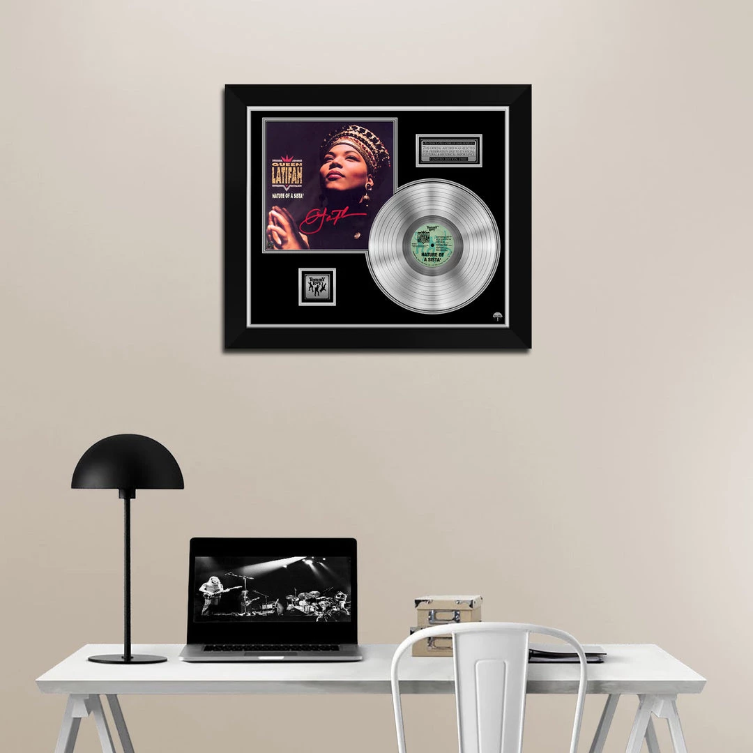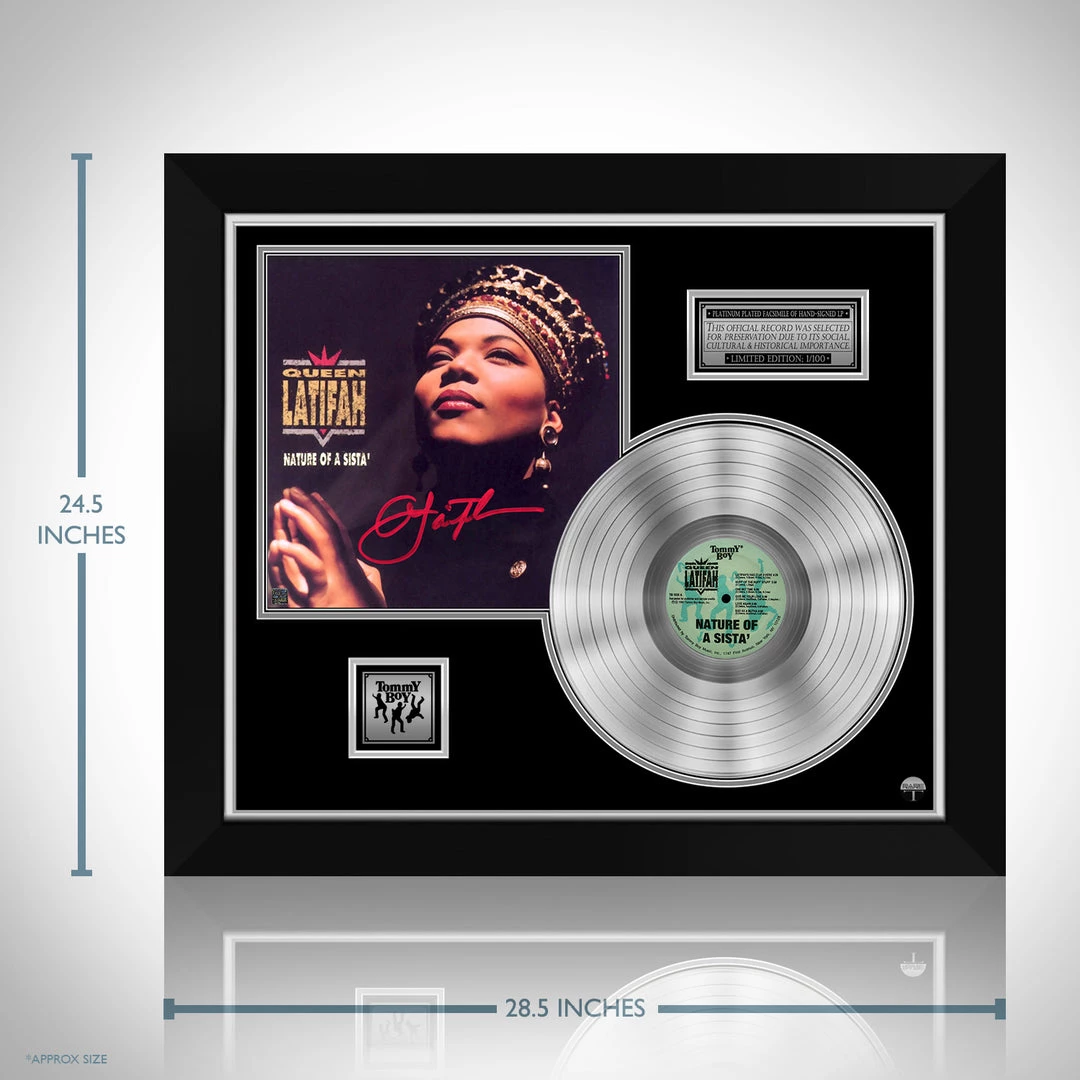 Pay homage to one of the most iconic American singer, songwriter, rapper, of all time Queen Latifah , with this gallery-framed, authentic Tommy boy Records fully licensed facsimile of the official Hand-Signed Platinum Plated LP Record and LP Cover Nature of a Sista Originally signed by Queen Latifah , of which is strictly limited to 100 units Worldwide and has been approved and numbered accordingly.