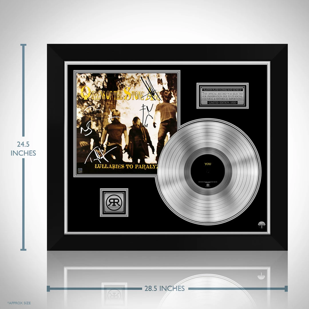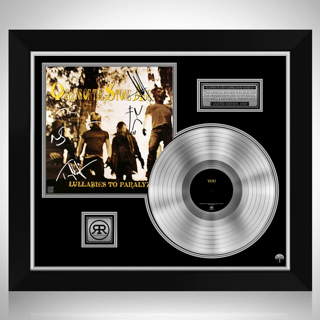 Pay homage to one of the most iconic American rock band of all time Queens of Stone age , with this gallery-framed, authentic Rekords Rekords fully licensed facsimile of the official Hand-Signed Platinum Plated LP Record and LP Cover Lullabies to paralyze Originally signed by Josh Homme, Alain Johannes, Van Leeuwen and Joey Castillo and Mark Lanegan , of which is strictly limited to 100 units Worldwide and has been approved and numbered accordingly.