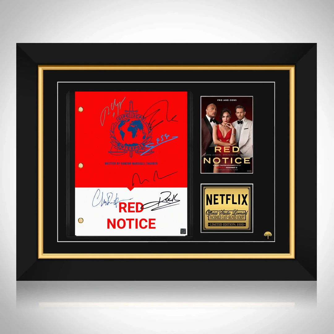 Pay homage to Red Notice , with this Netflix fully licensed facsimile of the official signed movie transcript, originally signed by actors Dwayne Johnson, Ryan Reynolds, Gal Gadot, Ritu Arya, Chris Diamantopoulos & Ed Sheeran , of which is strictly limited to 100 units Worldwide and has been approved and numbered accordingly.