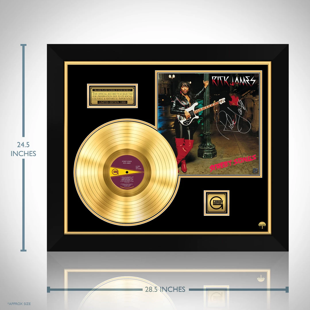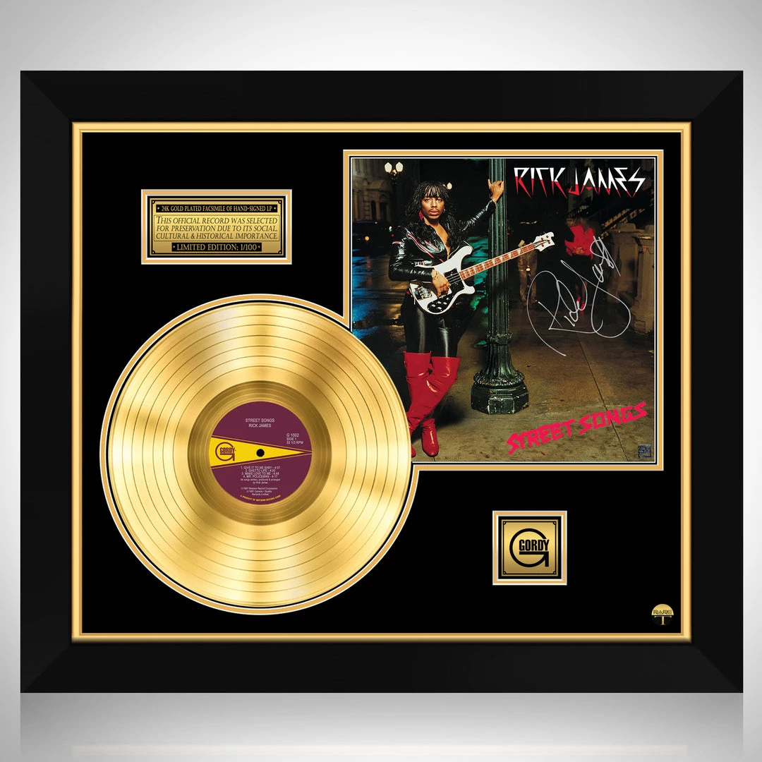 Pay homage to one of the most iconic American singer-songwriter, multi-instrumentalist, record producer of all time Rick James , with this gallery-framed, authentic Gordy Records fully licensed facsimile of the official Hand-Signed 24K Gold LP Record and LP Cover Street Songs Originally signed by Rick James , of which is strictly limited to 100 units Worldwide and has been approved and numbered accordingly.