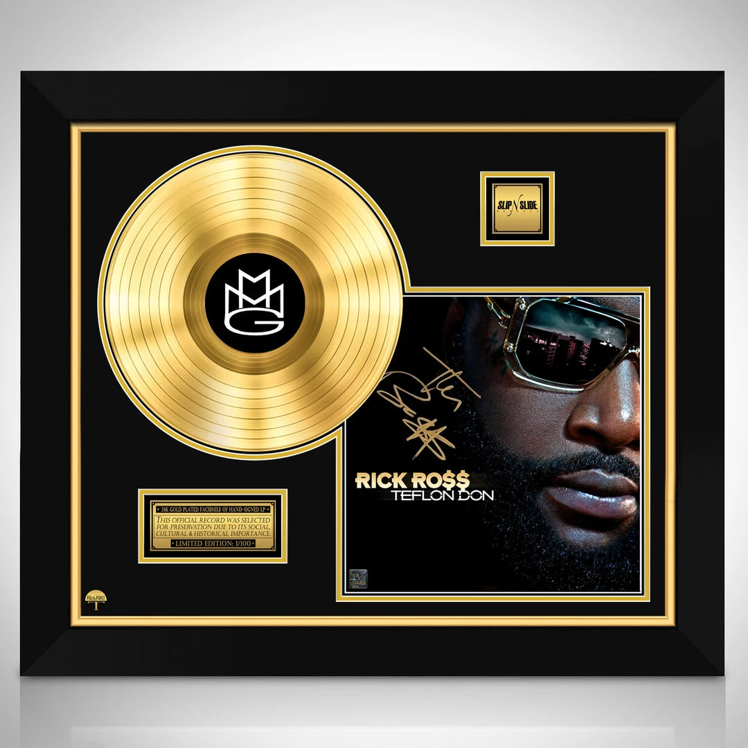 Pay homage to one of the most iconic rapper of all time Rick Ross with this gallery-framed, authentic Slip N Slide Records fully licensed facsimile of the official Hand-Signed 24K Gold Plated LP Record and LP Cover Teflon Don Originally signed by Rick Ross , of which is strictly limited to 100 units Worldwide and has been approved and numbered accordingly.