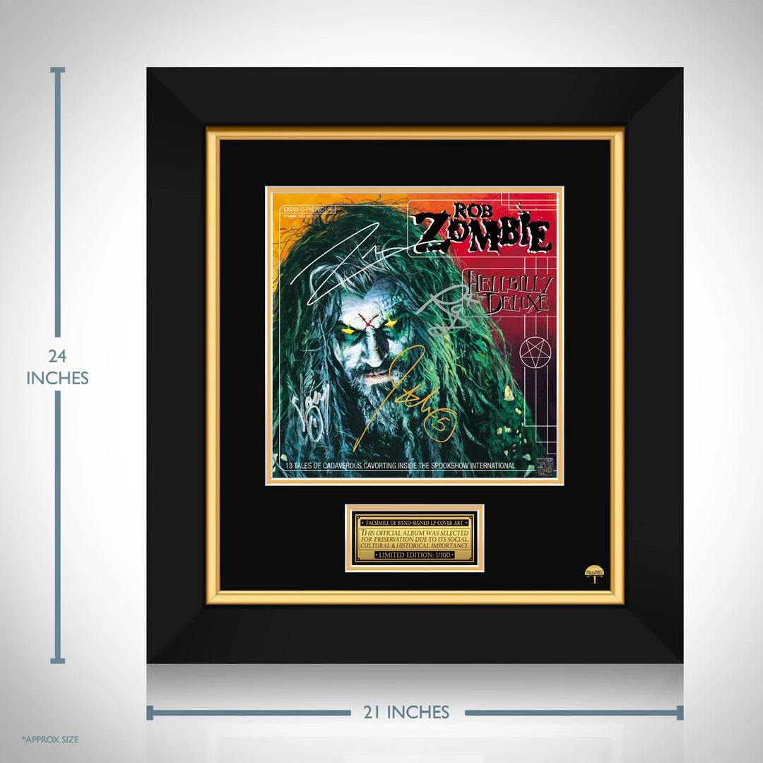 Pay homage to one of the most iconic American singer, songwriter, filmmaker, voice actor of all time, Rob Zombie , with this gallery-framed, officially licensed, limited edition facsimile of the Hand-Signed Hellbilly Deluxe LP Cover originally signed by Rob Zombie, Joey Jordison, John Lowery & Matt Montgomery , of which is strictly limited to 100 units Worldwide, and has been approved and numbered accordingly.