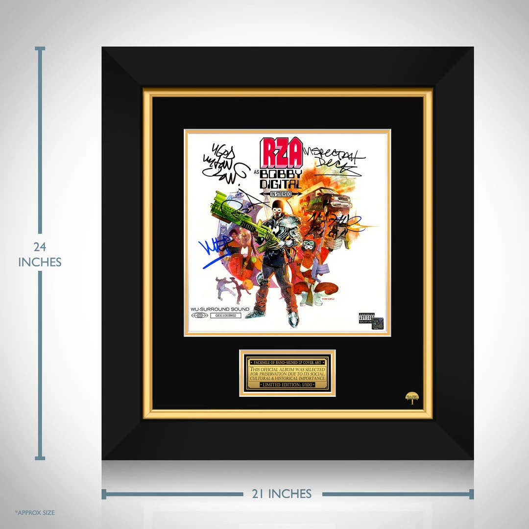 Pay homage to one of the most iconic American rapper of all time, RZA , with this gallery-framed, officially licensed, limited edition facsimile of the Hand-Signed as Bobby digital in Stereo LP Cover originally signed by RZA, Method Man, Masta Killa, Ghostface Killah, Inspectah Deck & U-God , of which is strictly limited to 100 units Worldwide, and has been approved and numbered accordingly.