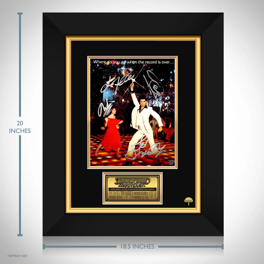 Pay homage to Saturday Night Fever, with this gallery-framed, officially licensed, limited edition facsimile of hand-signed promo photo, originally signed by Sir Barry Gibb, the late Maurice Gibb & Robin Gibb. & actor John Travolta, of which is strictly limited to 100 units Worldwide, and has been approved and numbered accordingly.